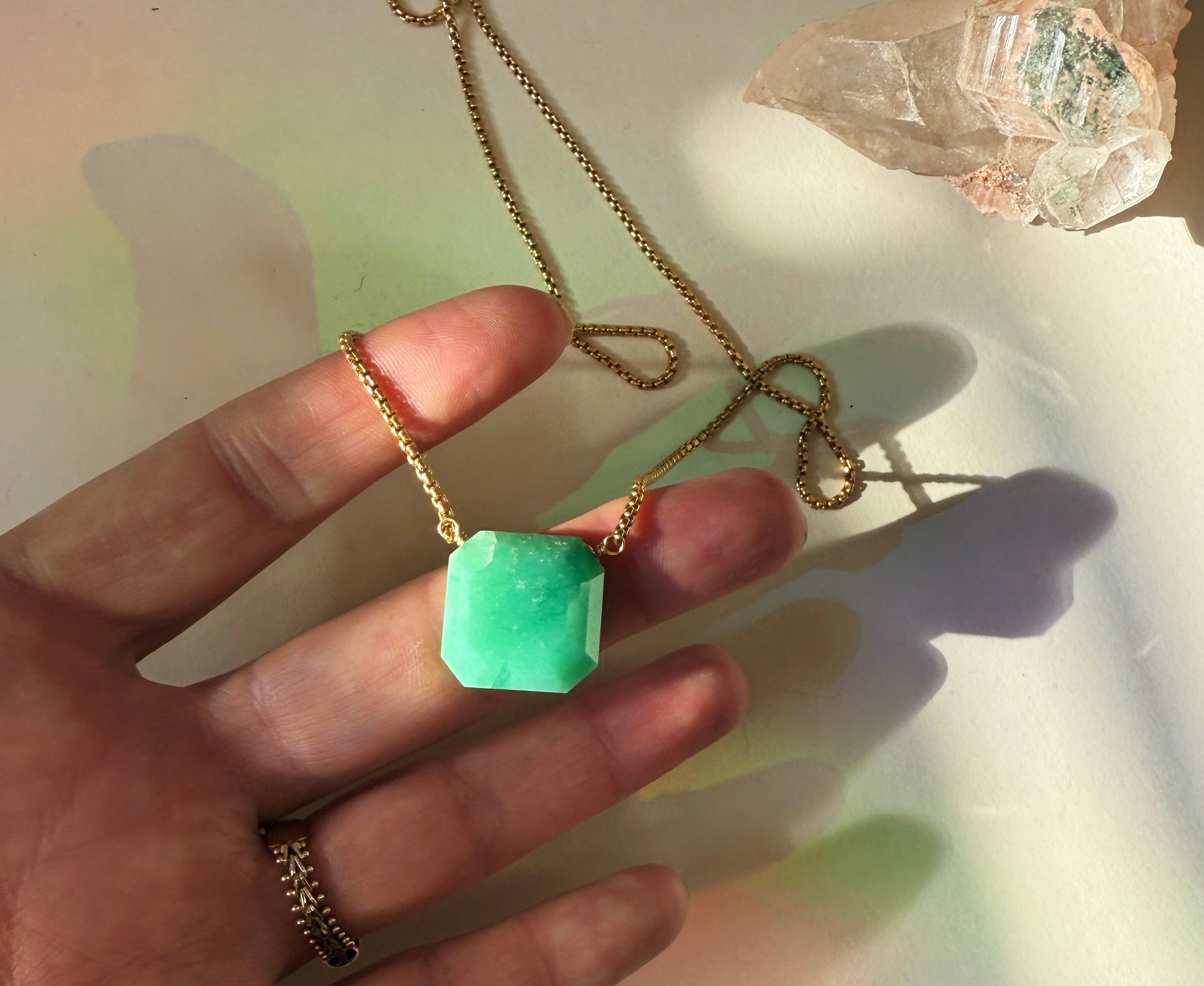 Chrysoprase cut like an emerald in a square carries her pure heart-energy: fresh green, serene, and alive with renewal. Chrysoprase is a stone of compassion, forgiveness, and emotional clarity---deep green of nature and love--- the very qualities Green Tara embodies. The square shape grounds her benevolence into structure, anchoring her blessings into the physical realm.