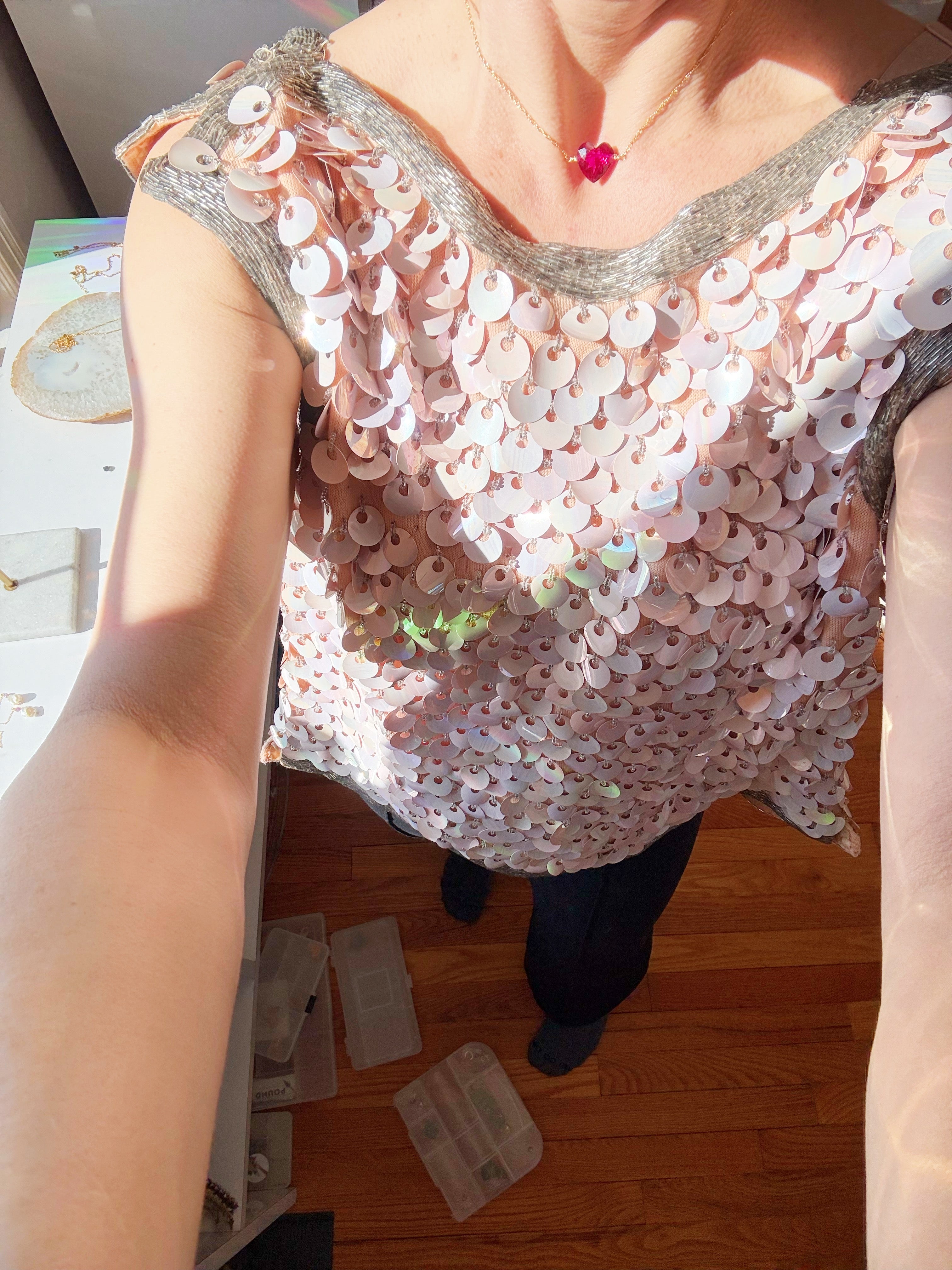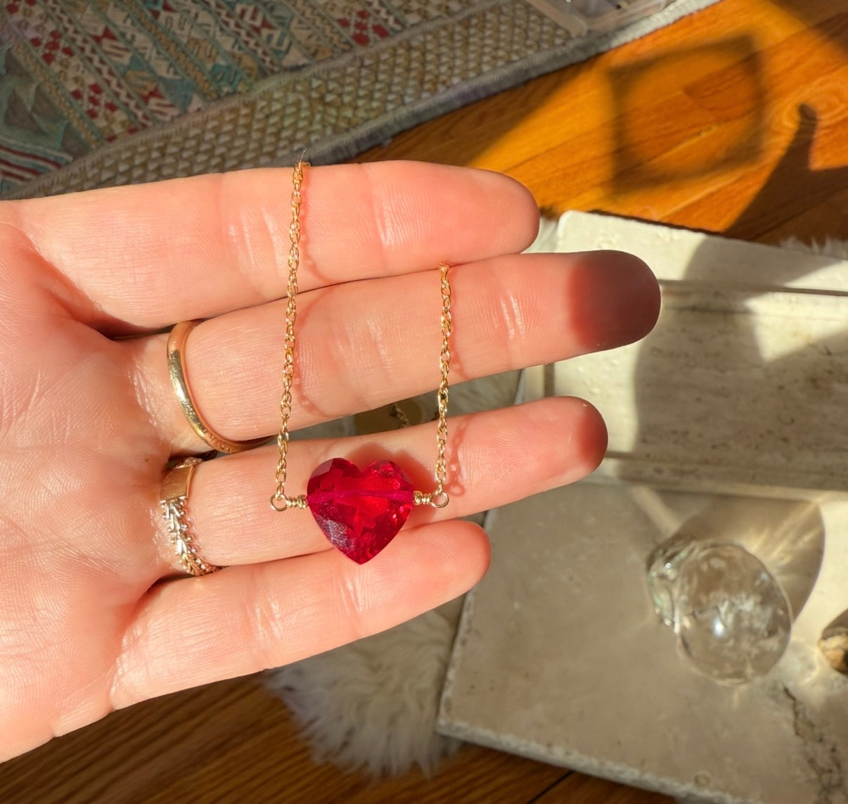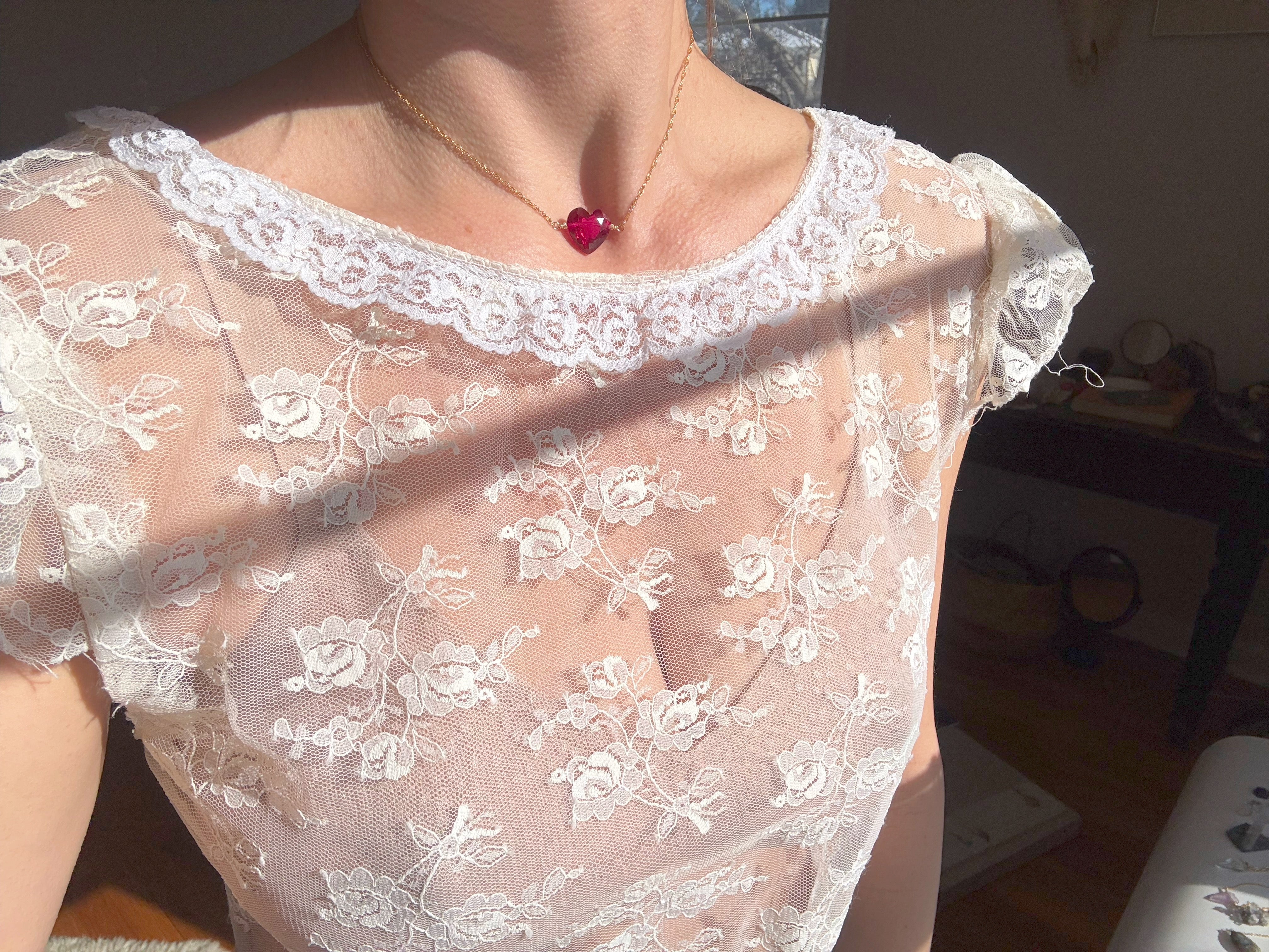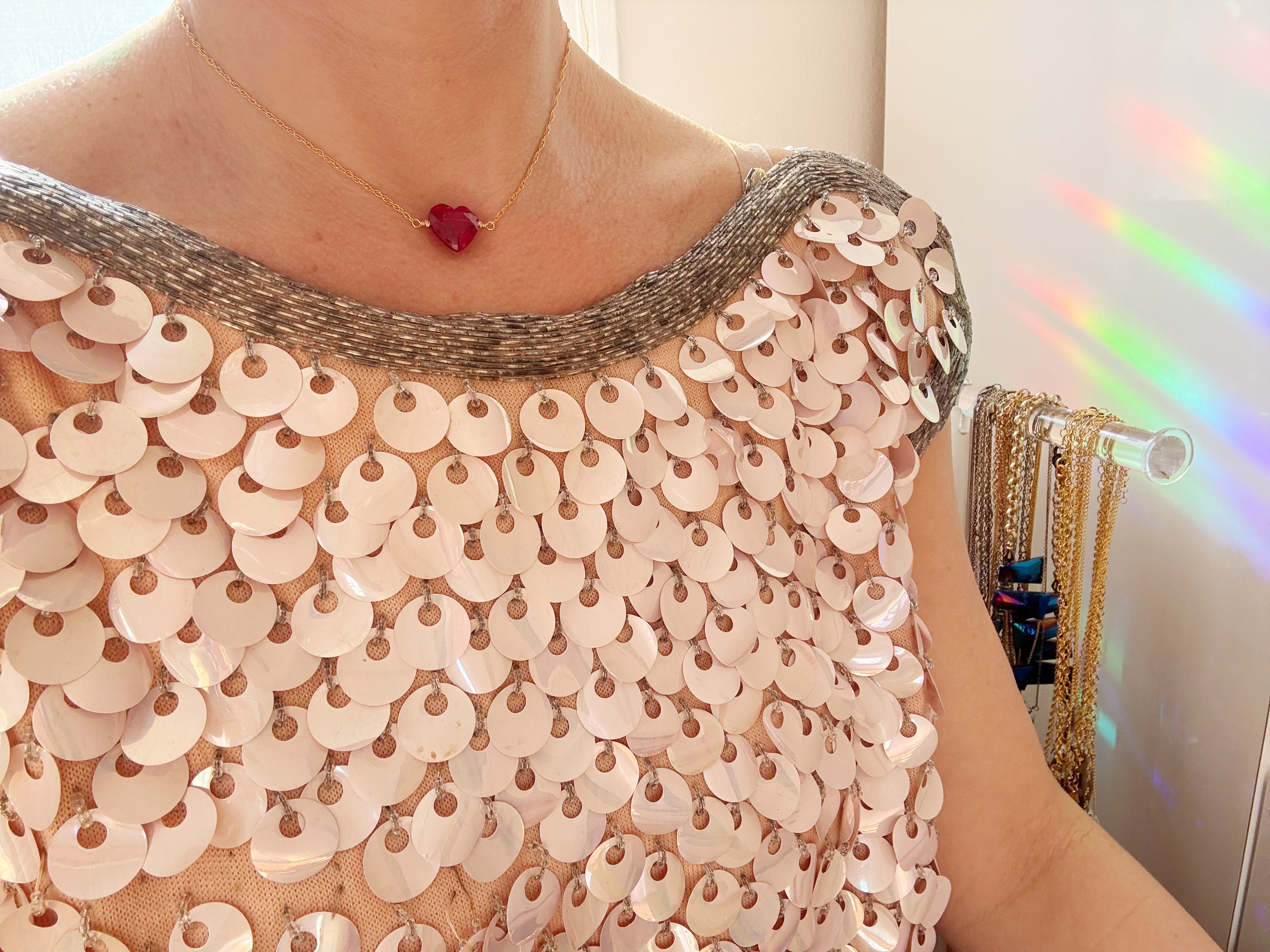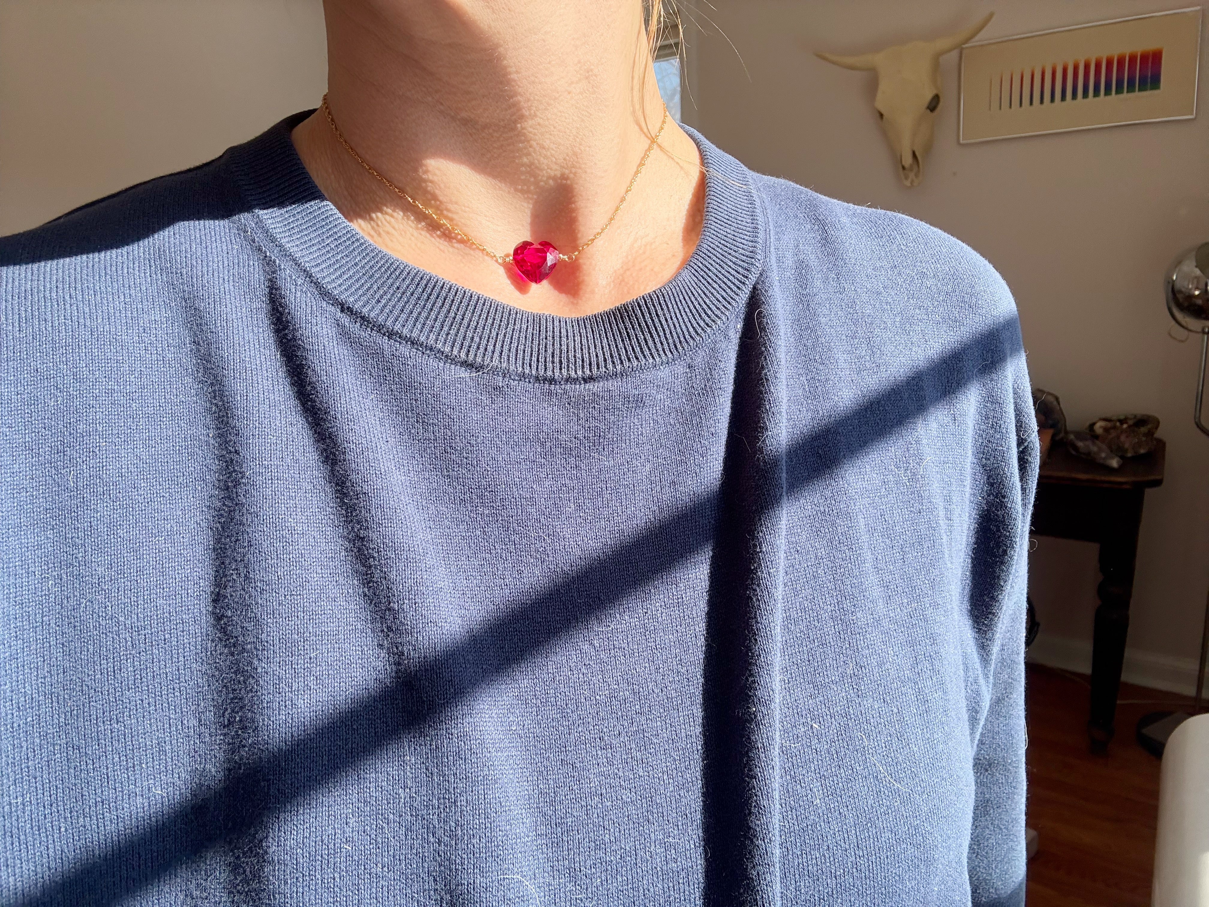 The heartbeat of the deep. A faceted rubellite heart — dark fuschia and bright like love— rests against the chest like a secret. It carries the thrum of emotion held in the body, the quiet intensity you can feel but not see.