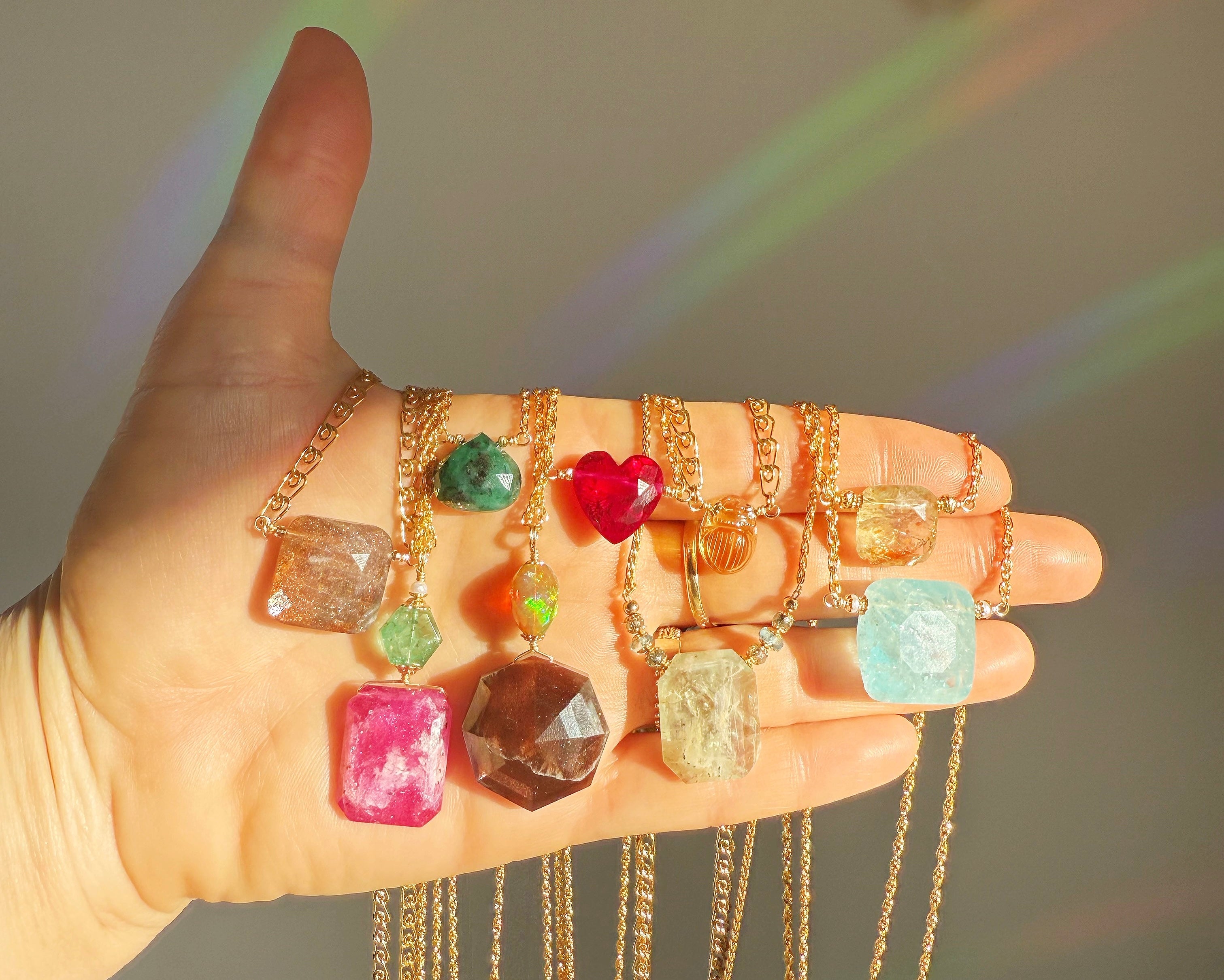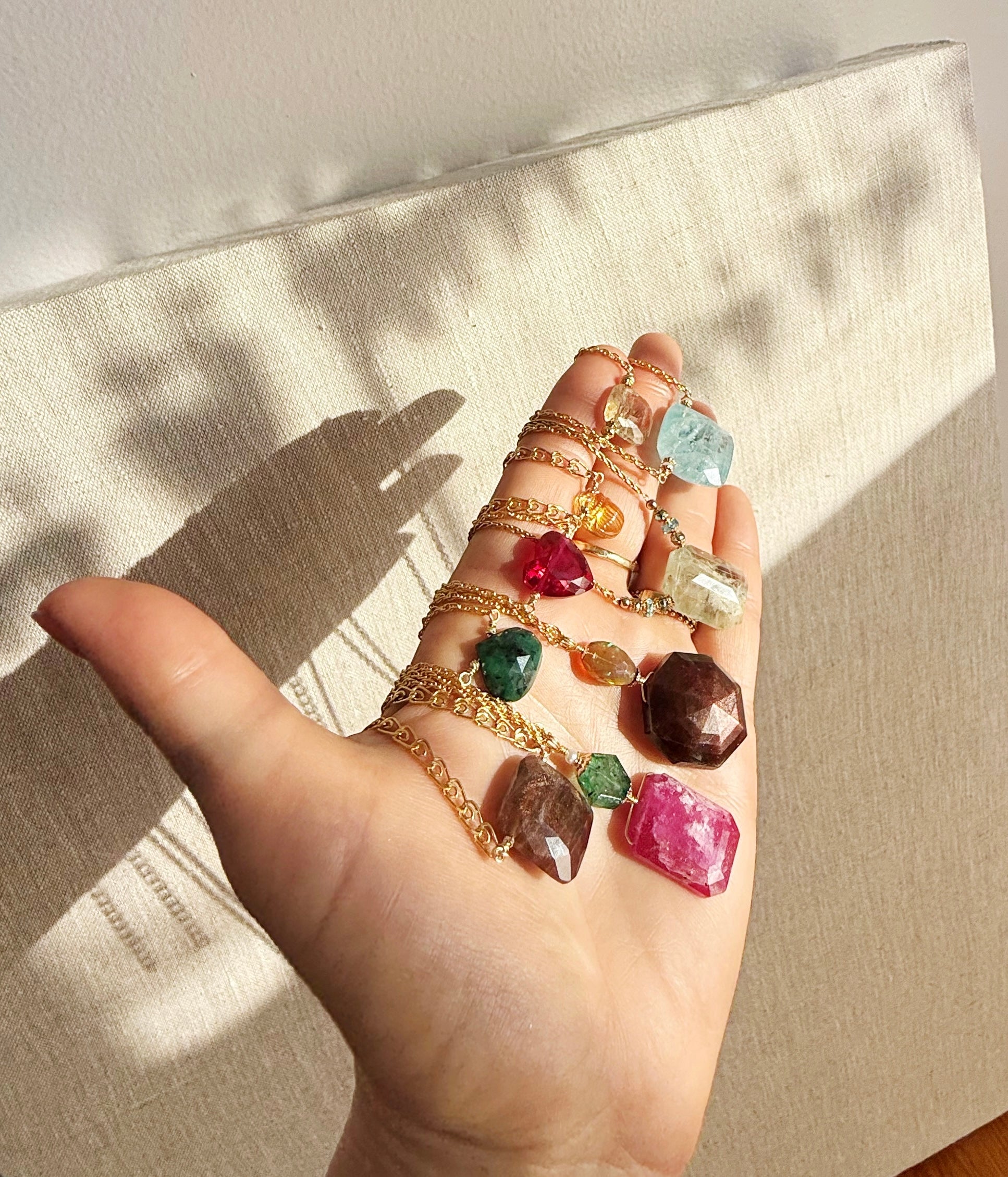 At its base: a square cut of rubellite which feels like rose-fire and is the stone of heart courage, emotional truth, and the ecstatic spark of life force.