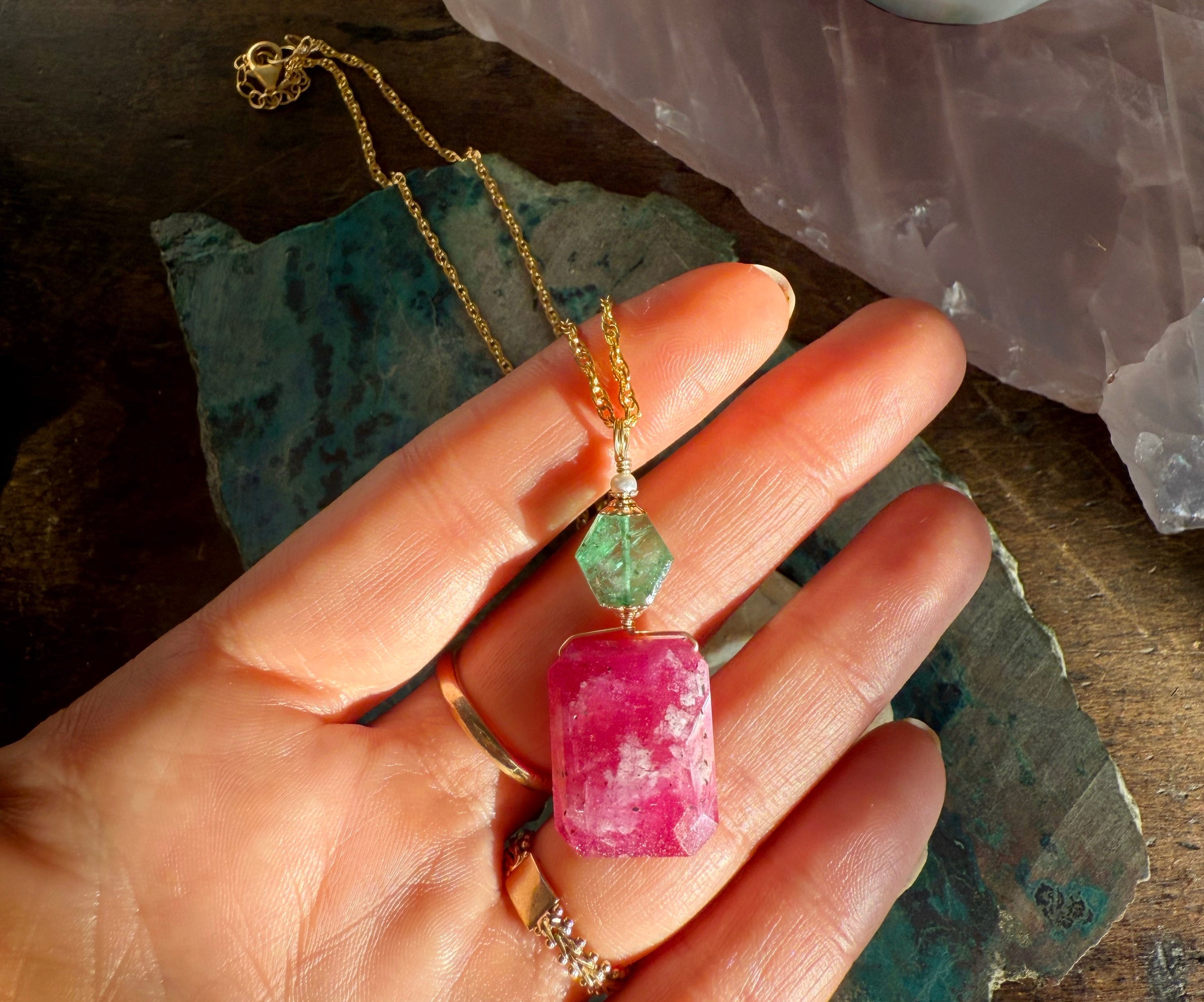 A talisman shaped like a miniature vessel of magic, this rubellite and emerald pendant carries the essence of an ancient perfume bottle. A vessel holding enchantment with the radiance of the chakra colors of the heart.