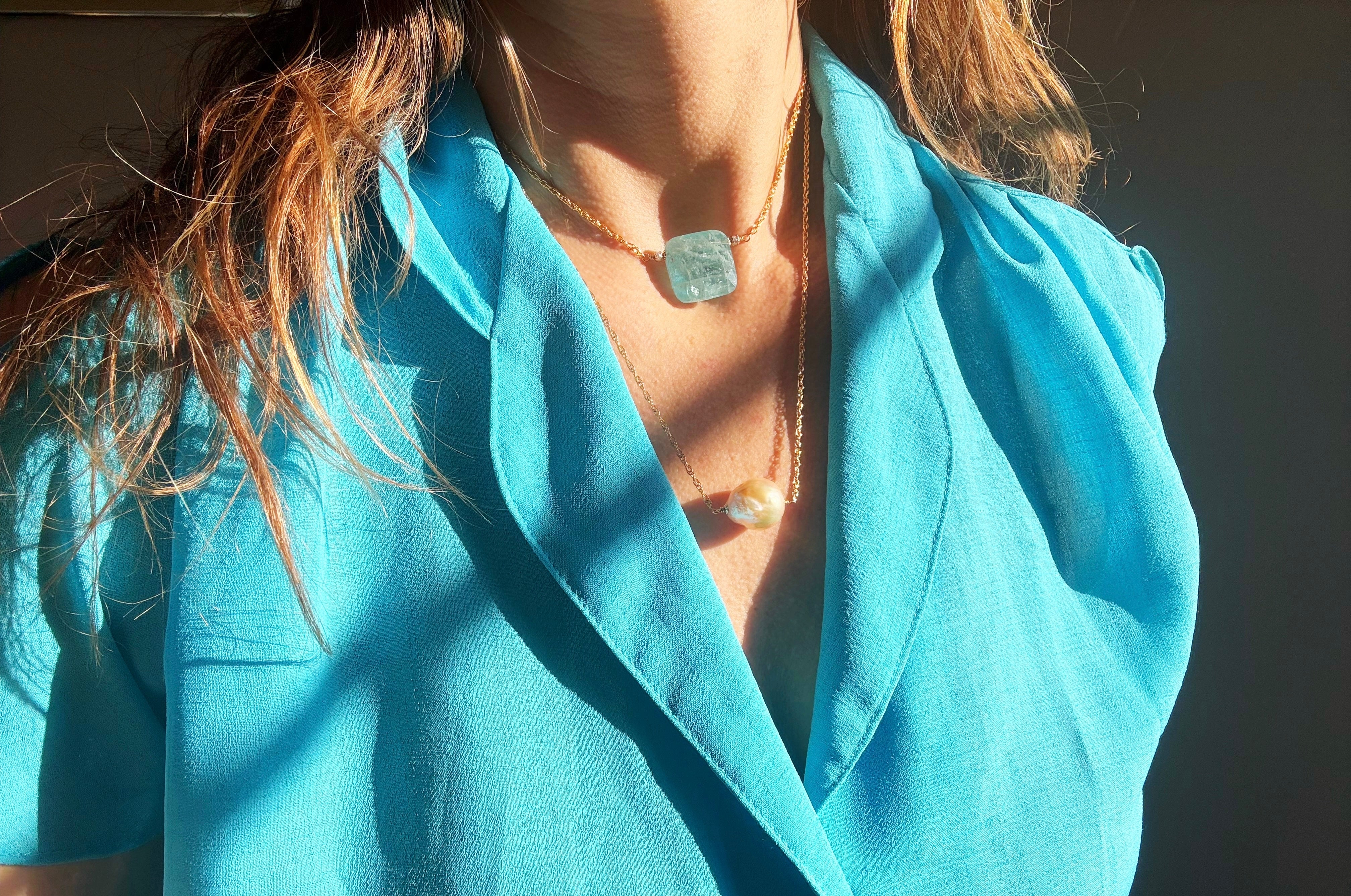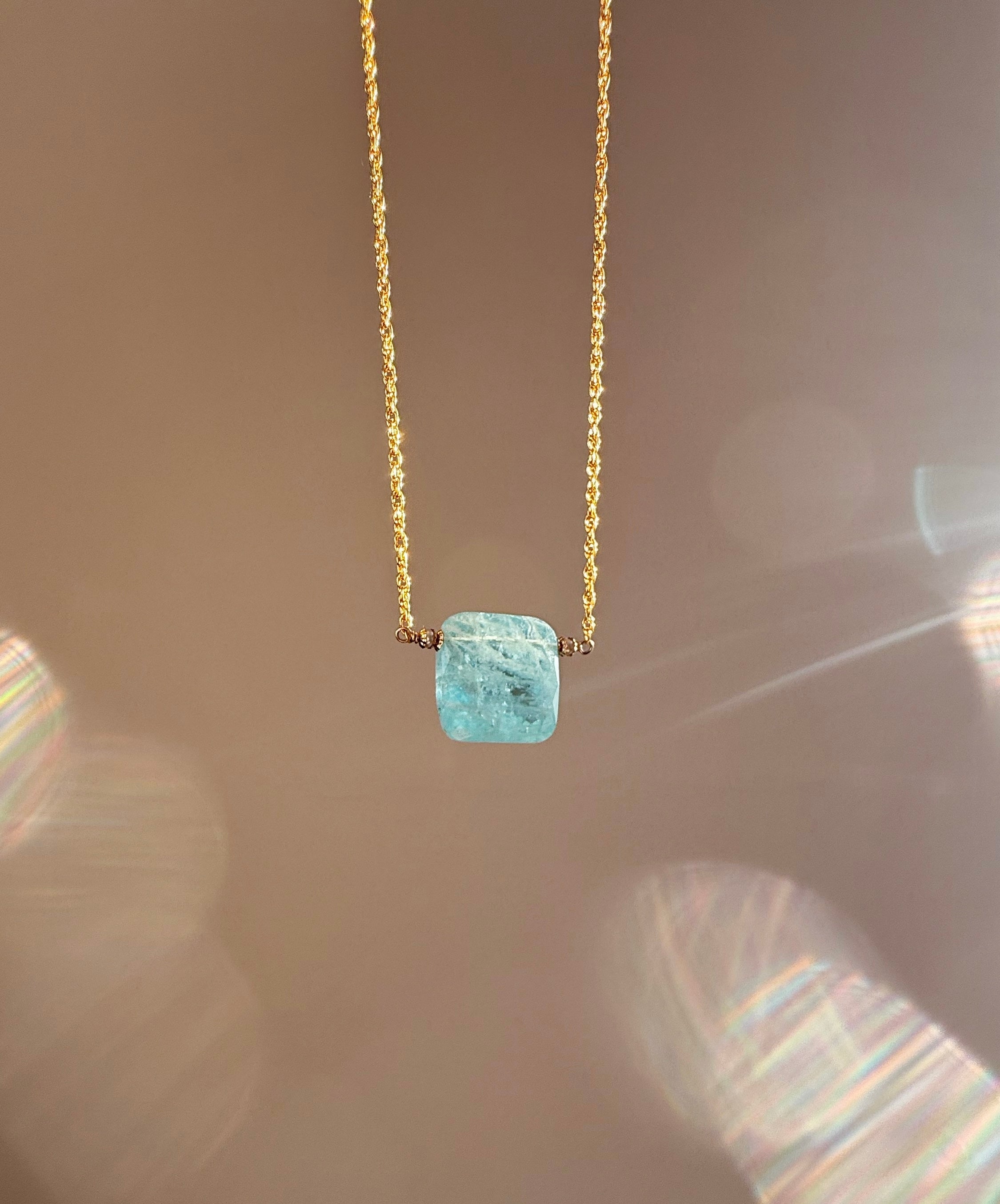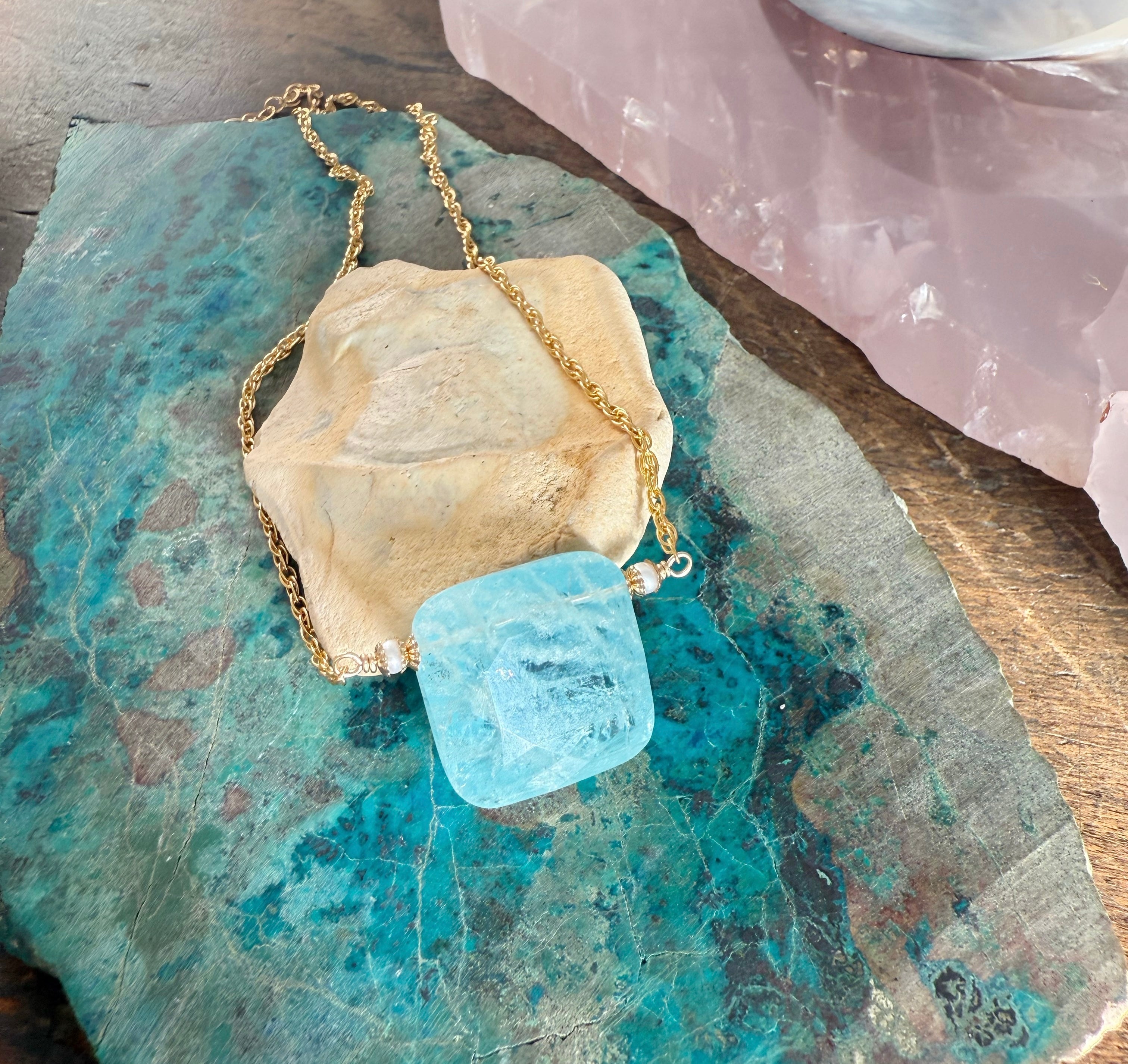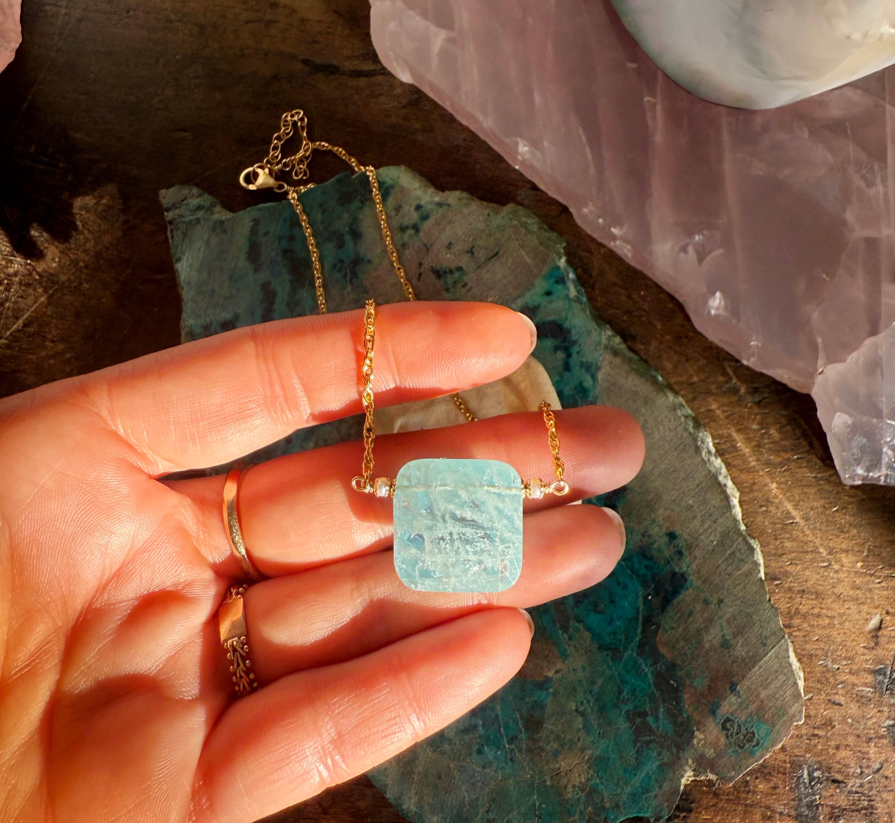 A square window of living water. Aquamarine softens the voice, clears the channel, and calls in courage through calm. Worn at the throat like a tidal amulet, this piece steadies the nervous system and restores truth, serenity, and flow.