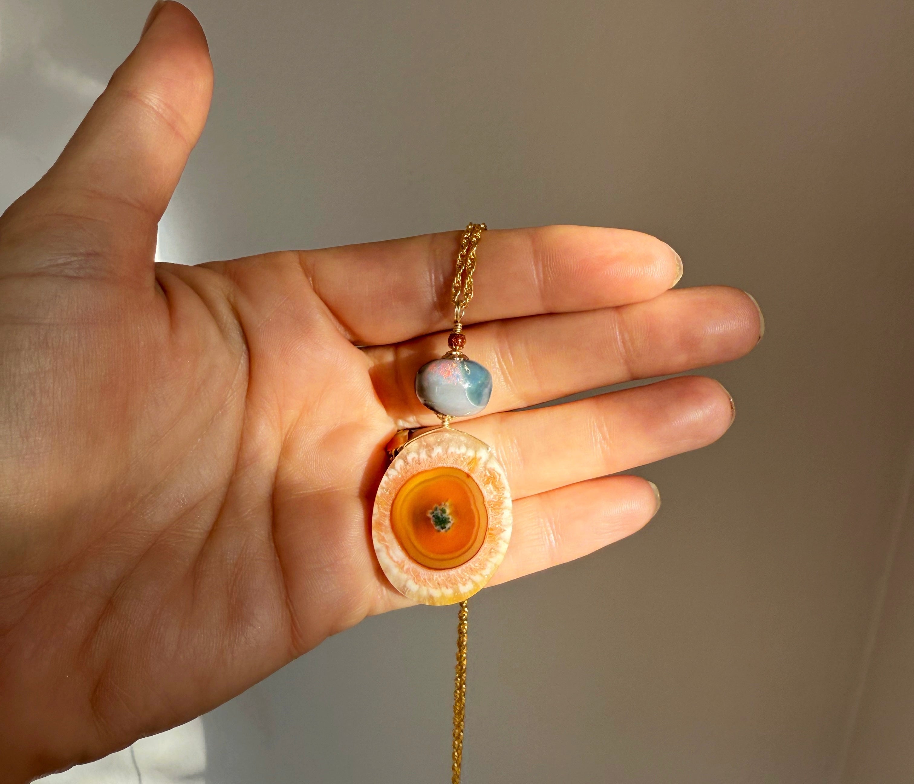 This talisman evokes the power of transformation, courage, and divine protection. Each flash within the opal feels like the spark of new creation, and the solar quartz radiates strength from within.