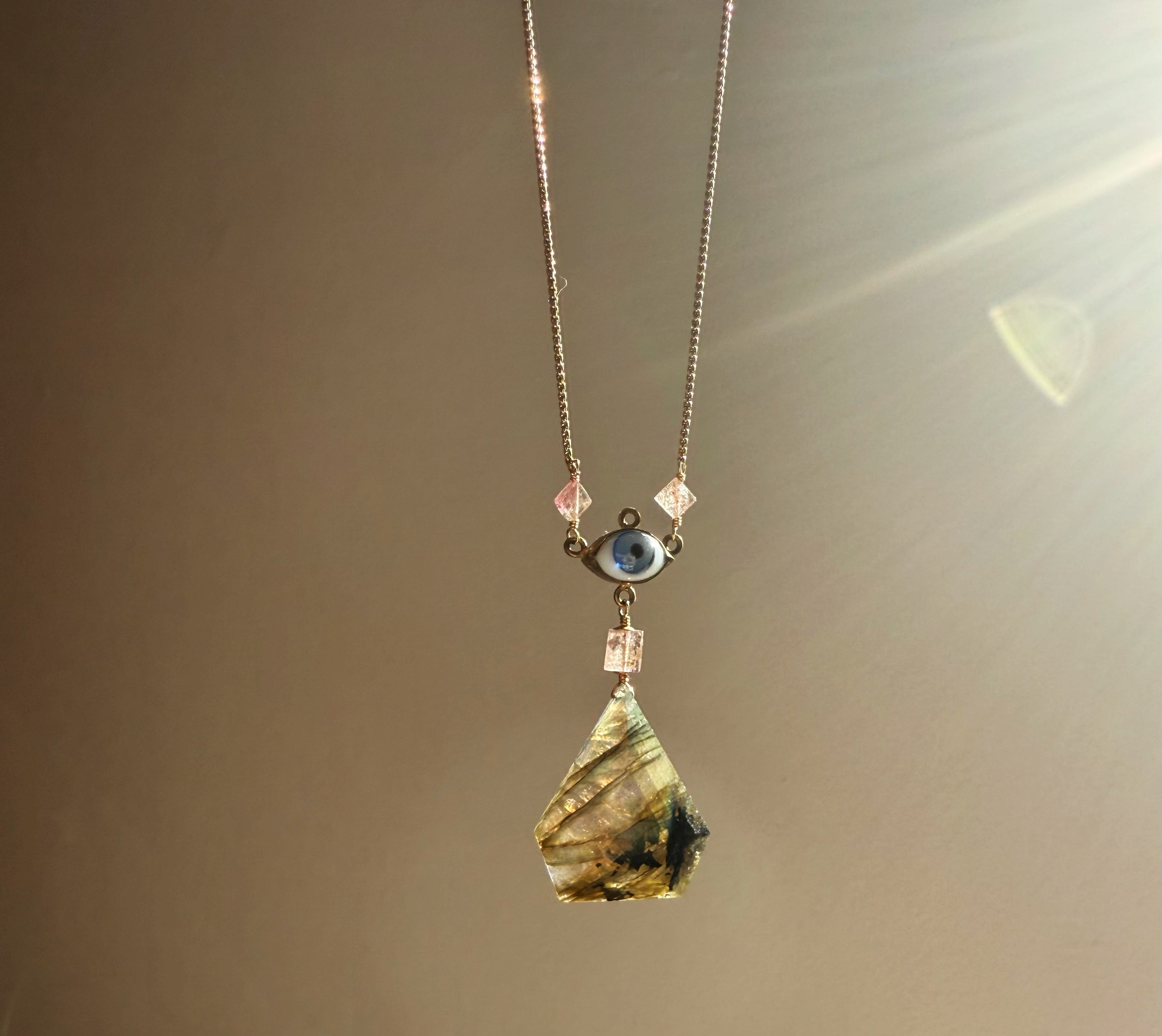 Atop the labradorite, it becomes the “third eye” of the piece.