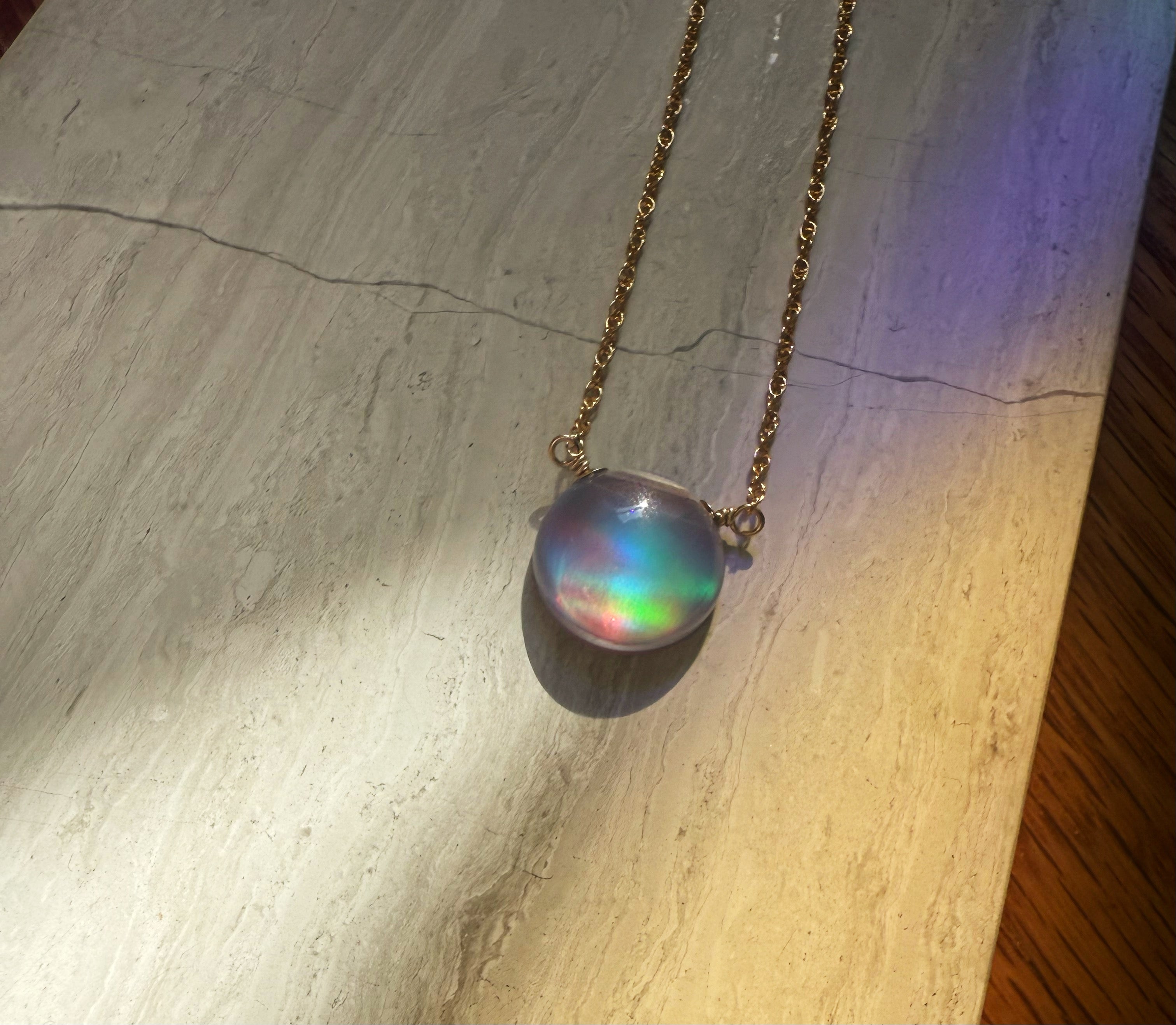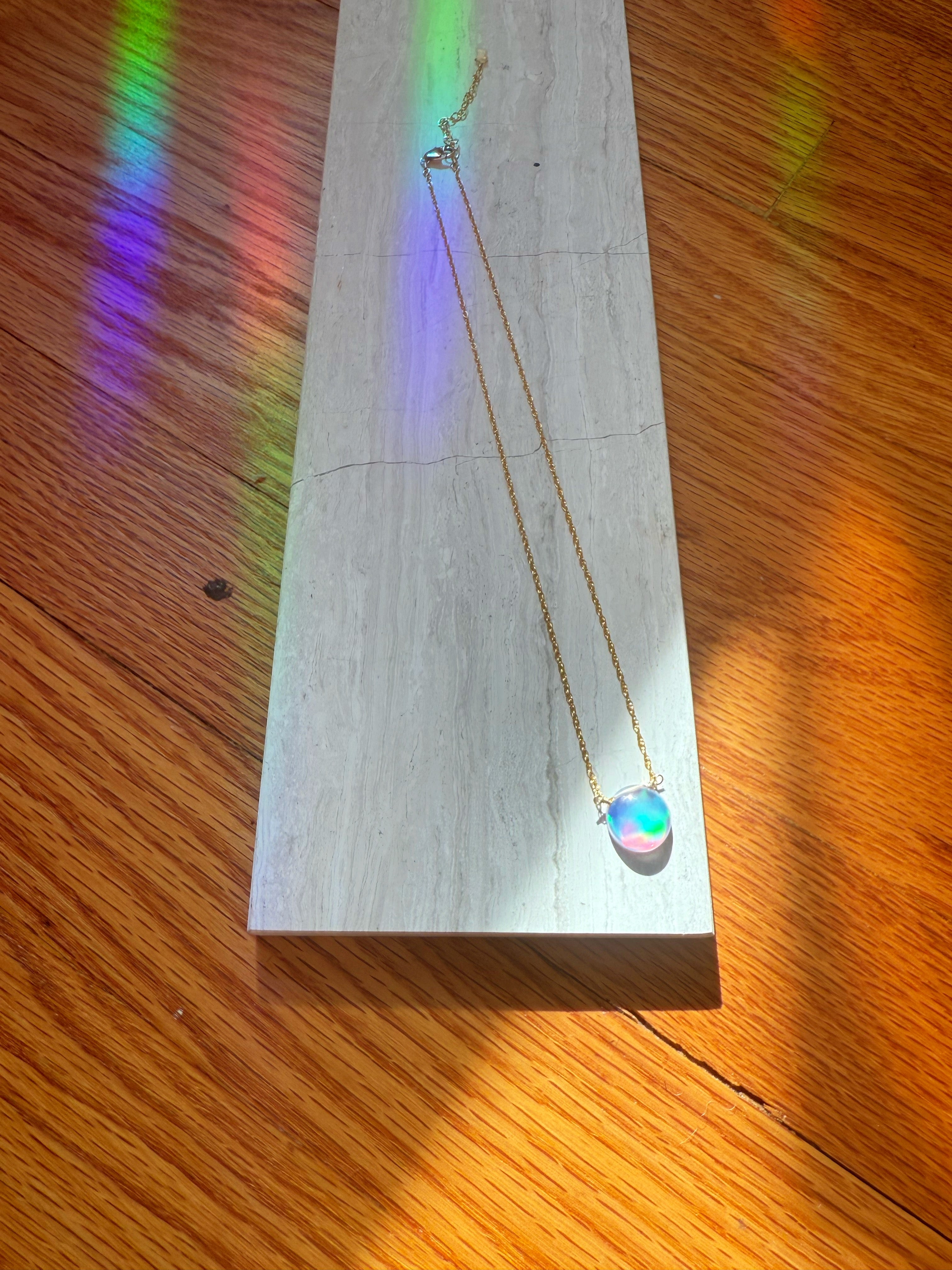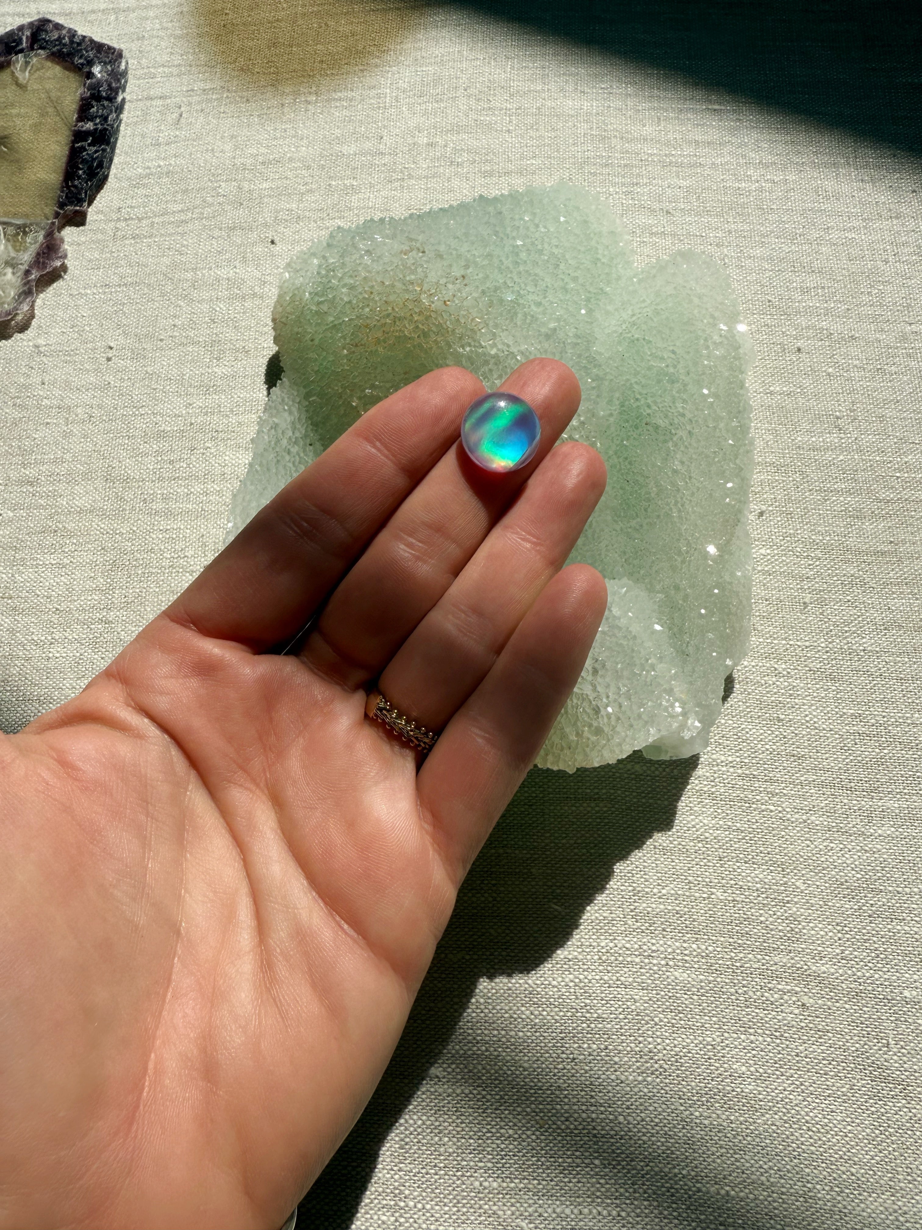 An Aurora Opal Orb. She is an enchanting globe of oracular light and carries the energies of awakening, illumination, and transformation. The name “Aurora” evokes the dawn, the renewal of light after darkness, and the shimmer of the Northern Lights—making it a stone of hope and cosmic connection. Like a comet from outside the galaxy coming to show us something new about our own world before she flies off with a tail of green glitter following.