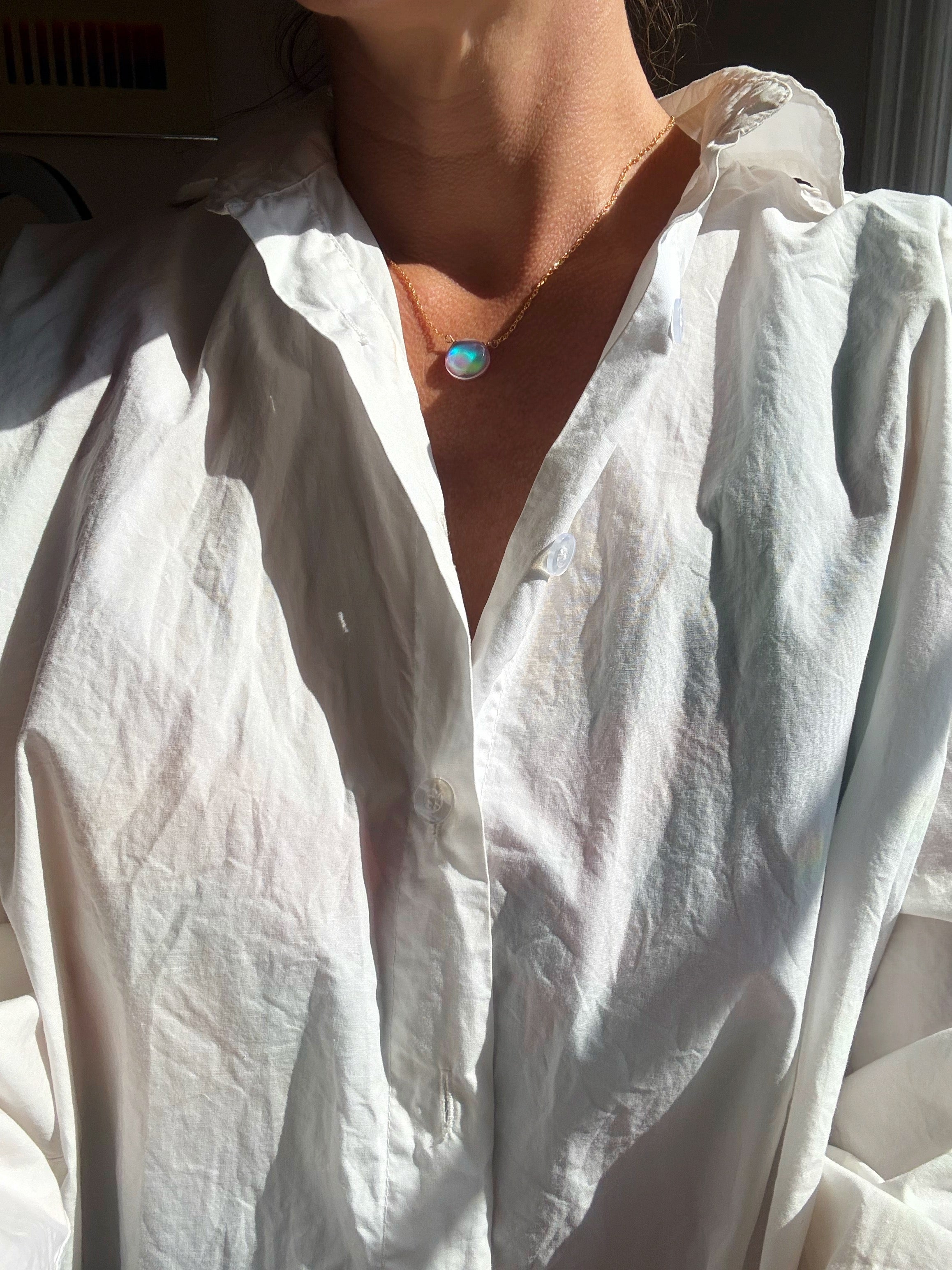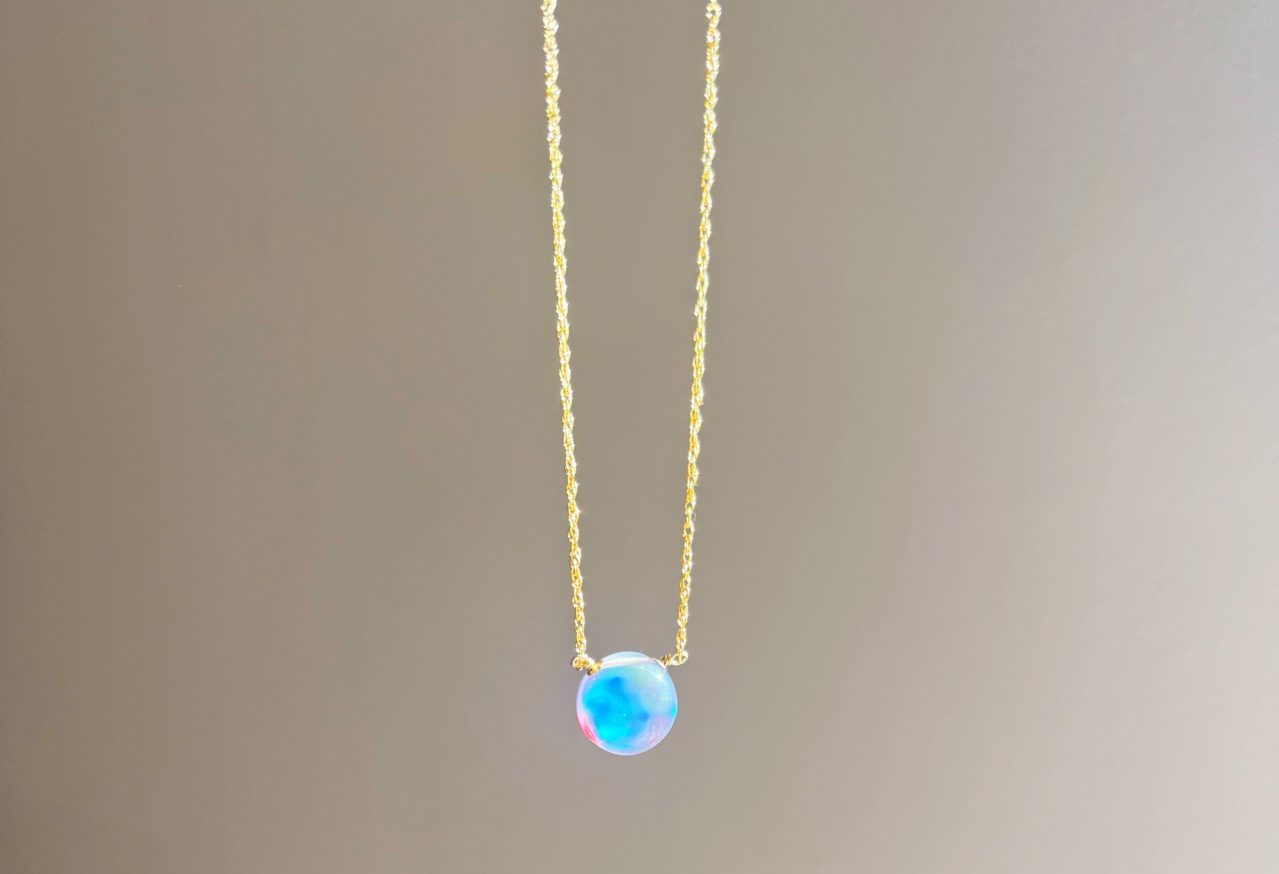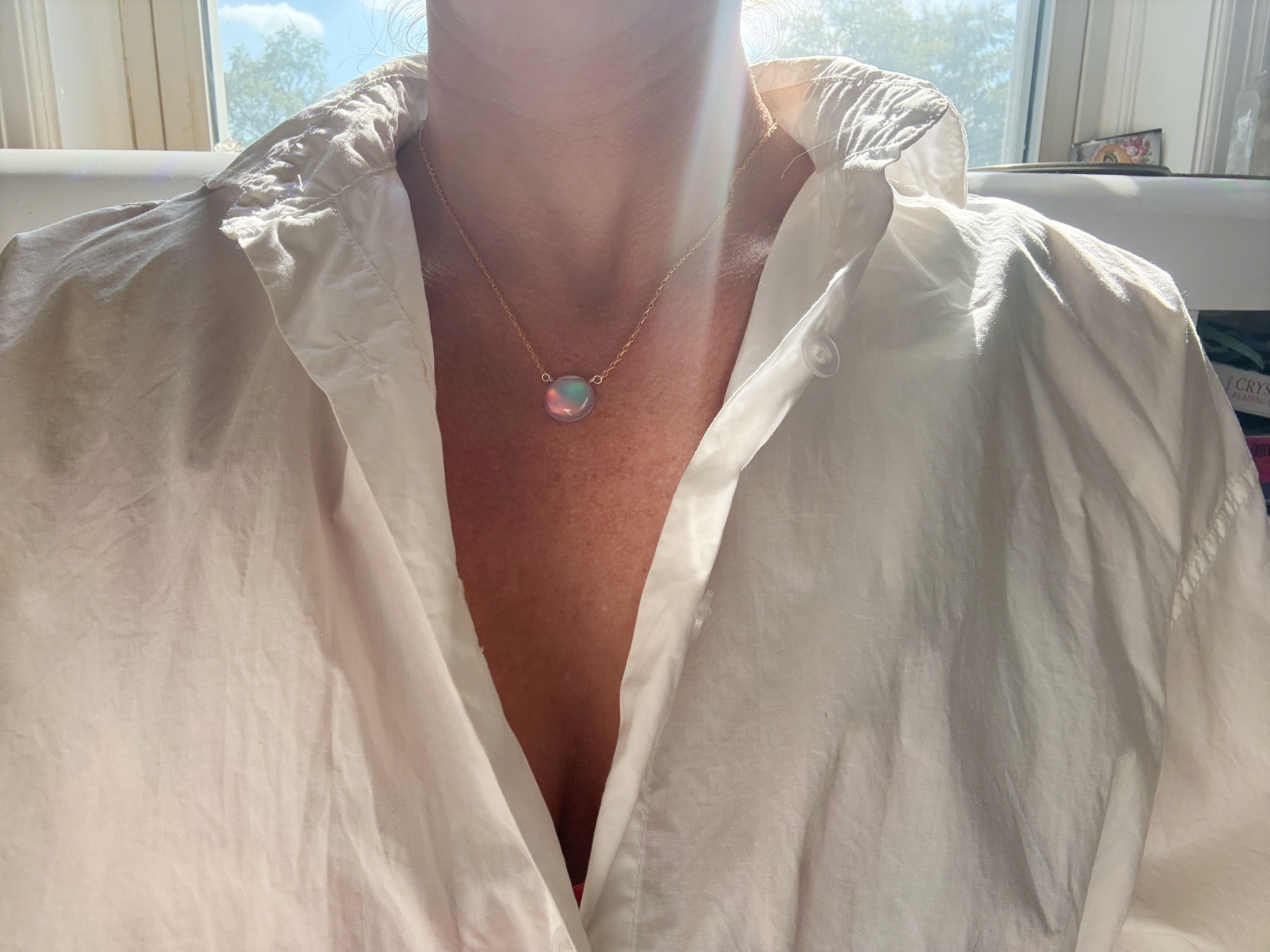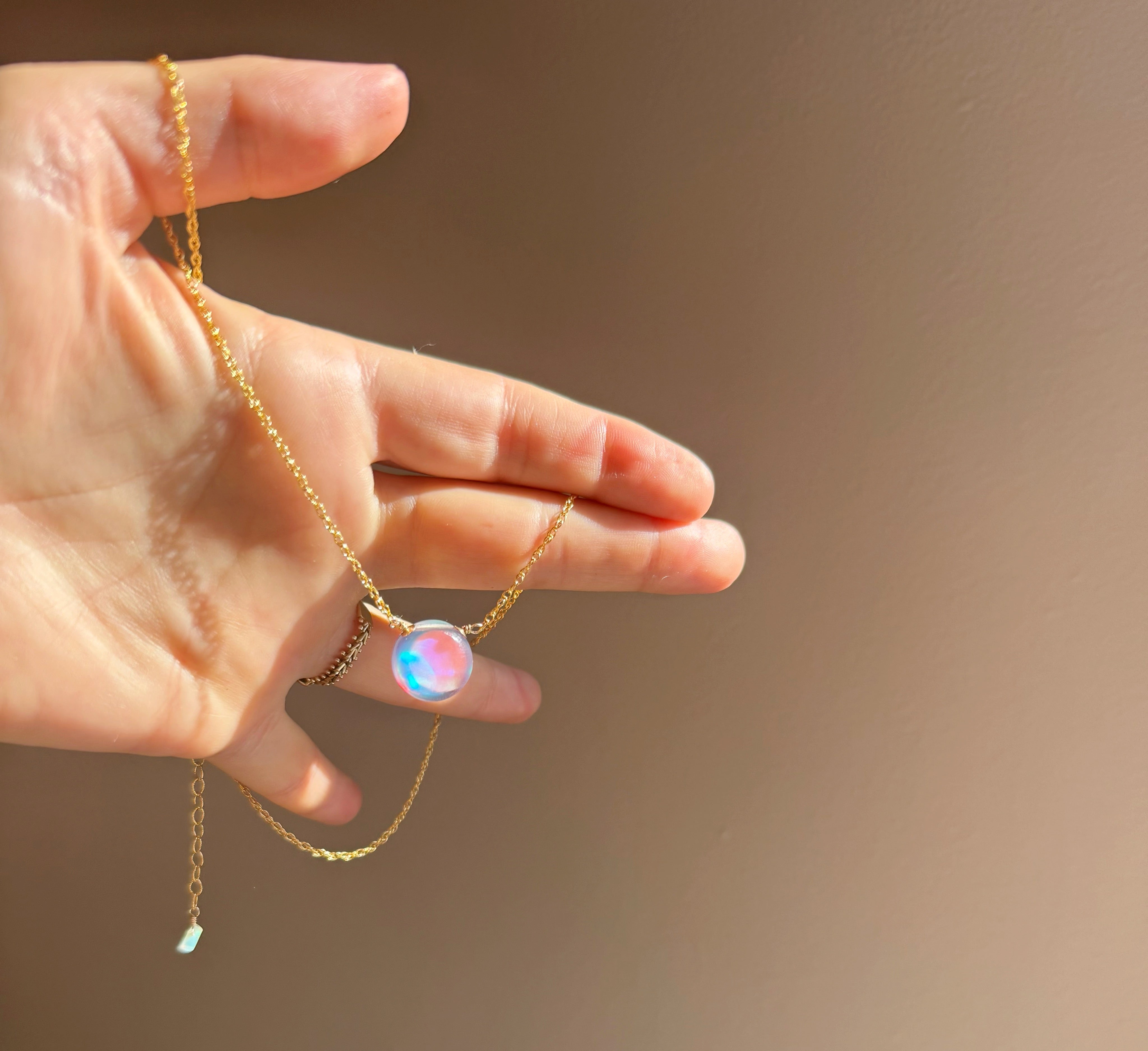 An Aurora Opal Orb. She is an enchanting globe of oracular light and carries the energies of awakening, illumination, and transformation. The name “Aurora” evokes the dawn, the renewal of light after darkness, and the shimmer of the Northern Lights—making it a stone of hope and cosmic connection. Like a comet from outside the galaxy coming to show us something new about our own world before she flies off with a tail of green glitter following.