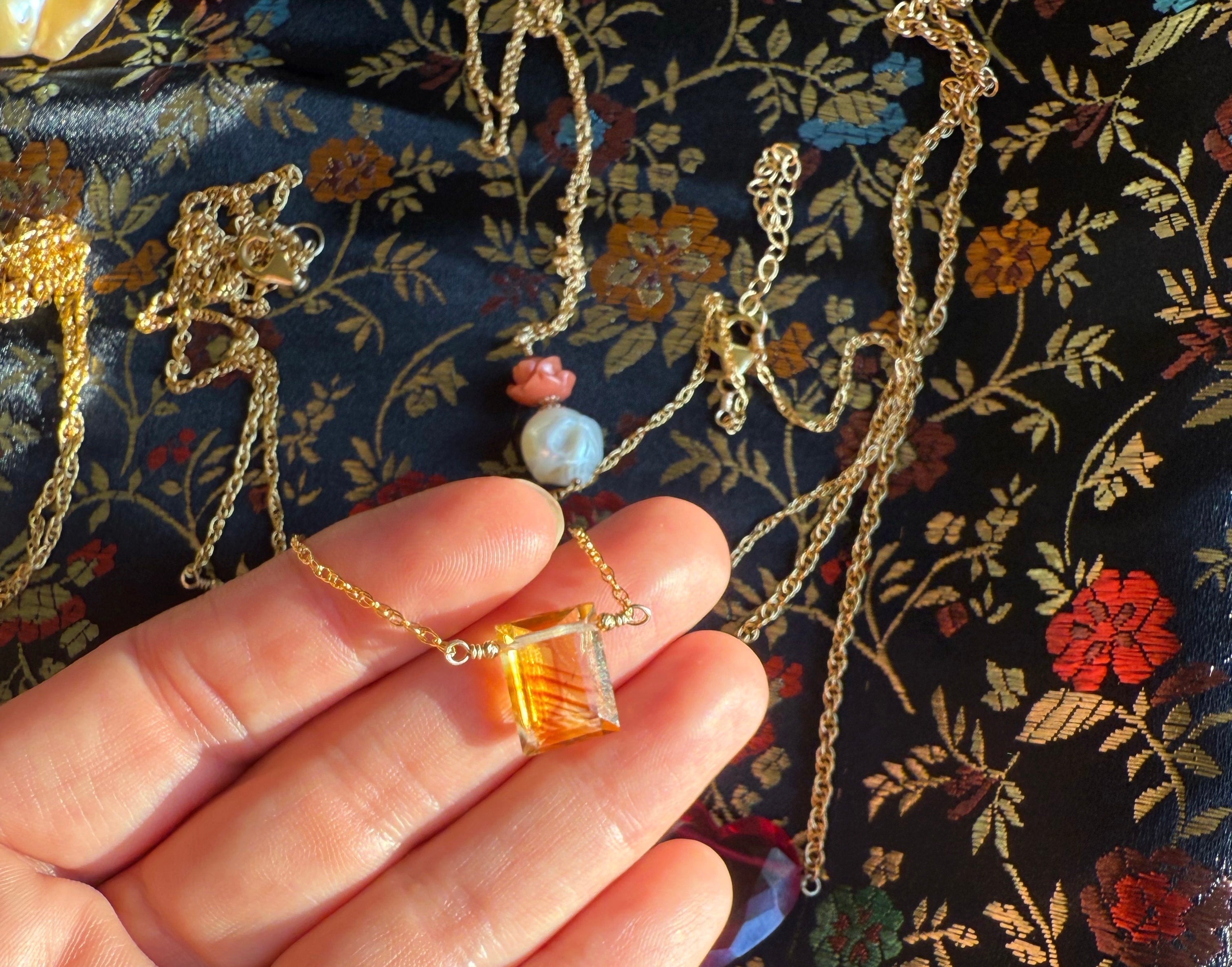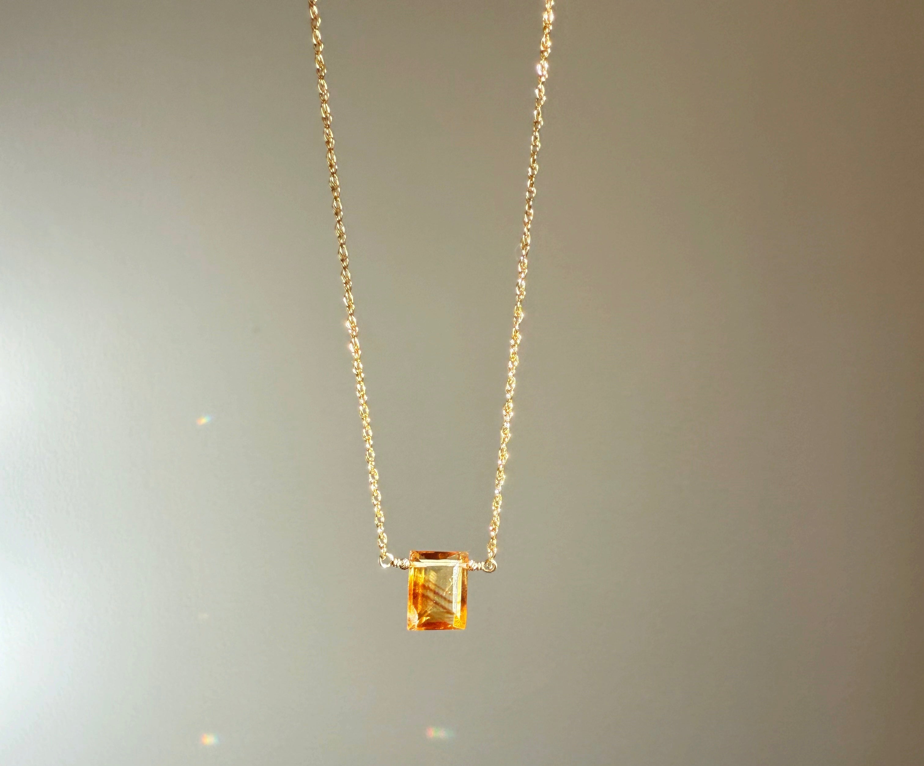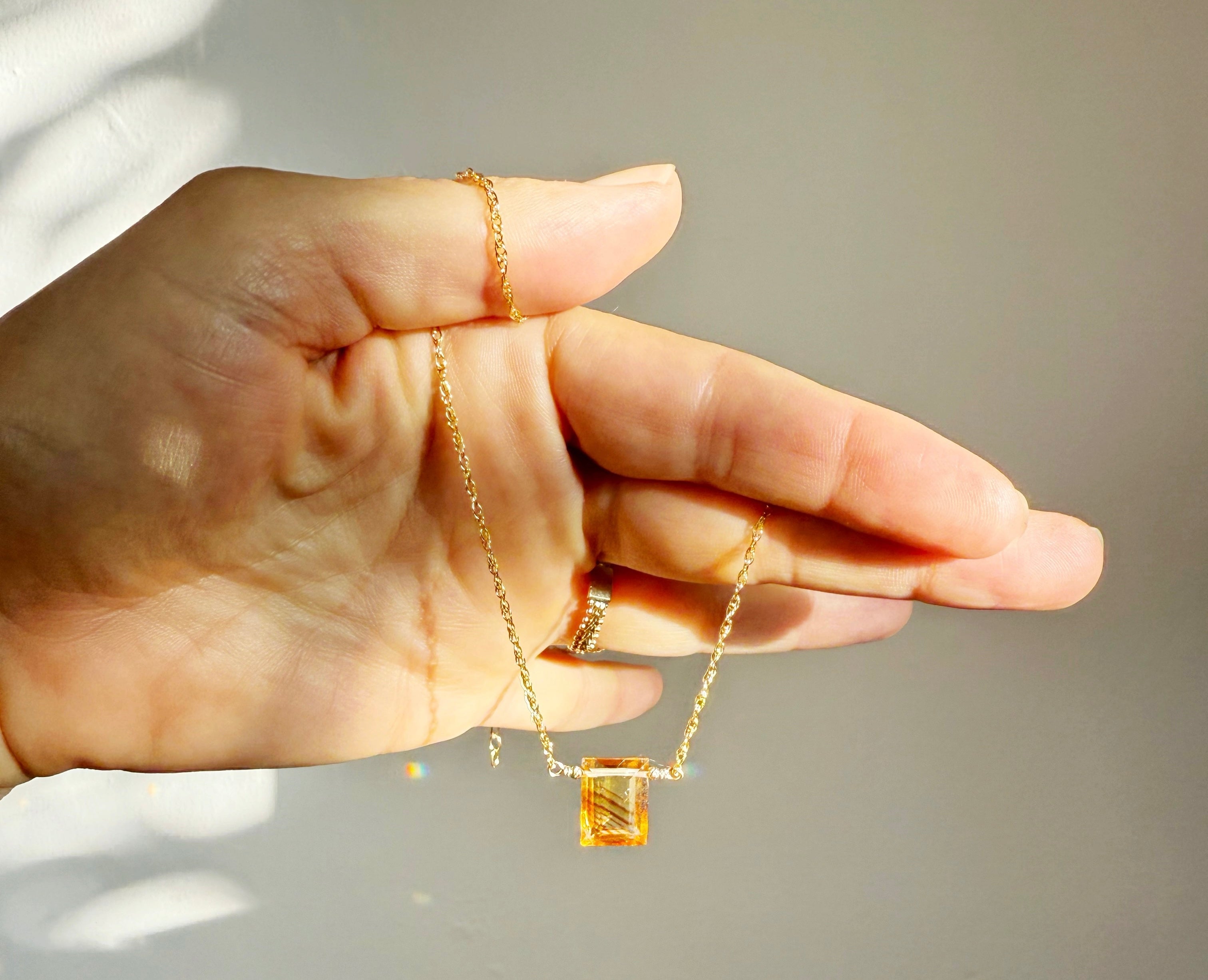 An emerald-cut citrine, sharp-edged and sunlit, catching light like a pane of honeyed glass. It rests against the chest like a small sun — bringing warmth, joy, and the golden frequency of abundance.