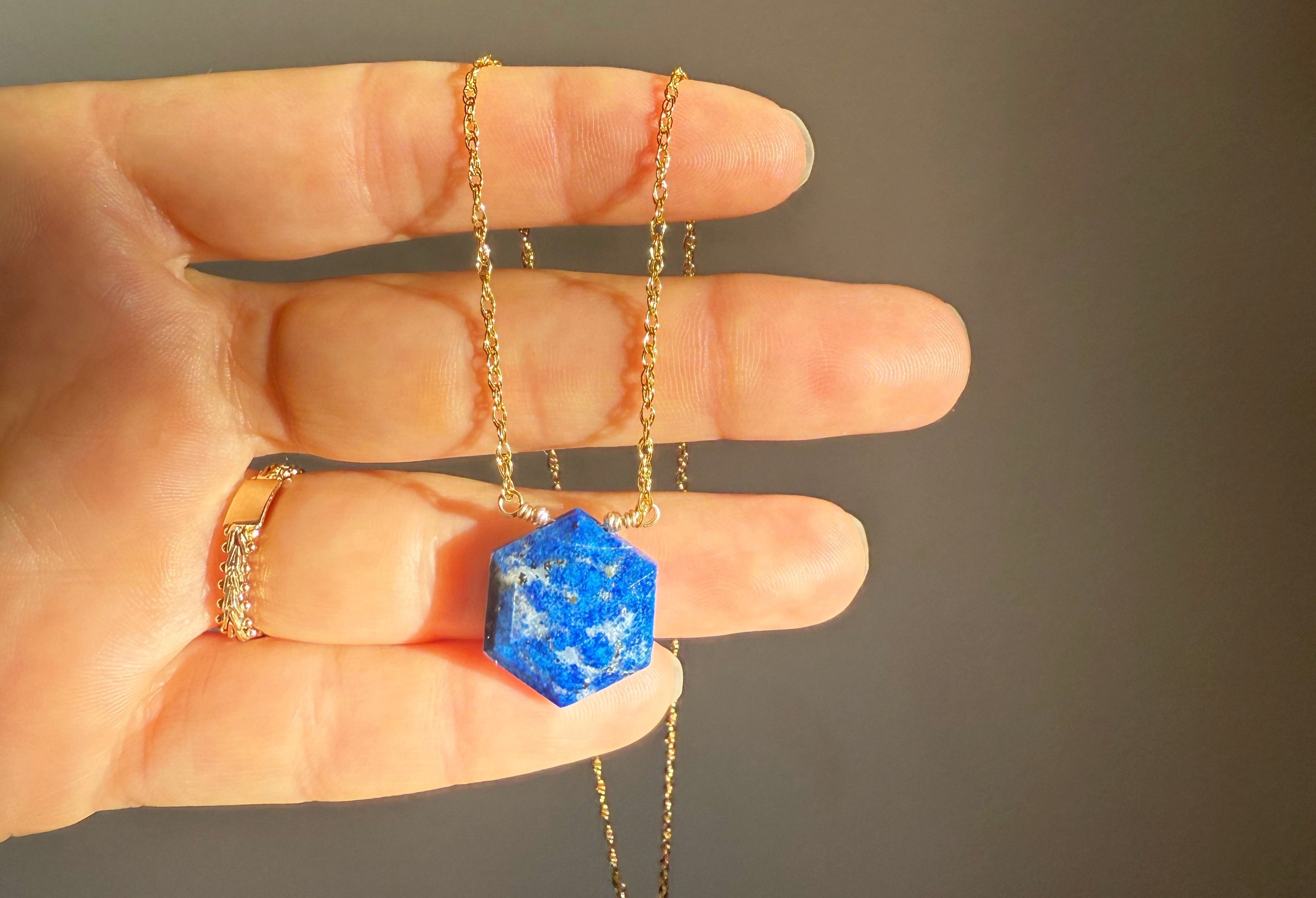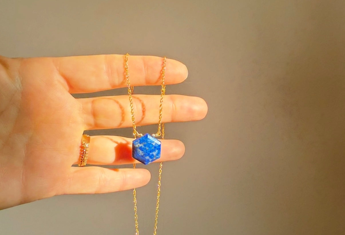 A hexagon carved from lapis lazuli — deep indigo like midnight water, flecked with pyrite stars. The geometry echoes nature’s quiet precision (honeycomb, snowflake, water molecule), while its color holds the ancient seas and celestial skies.