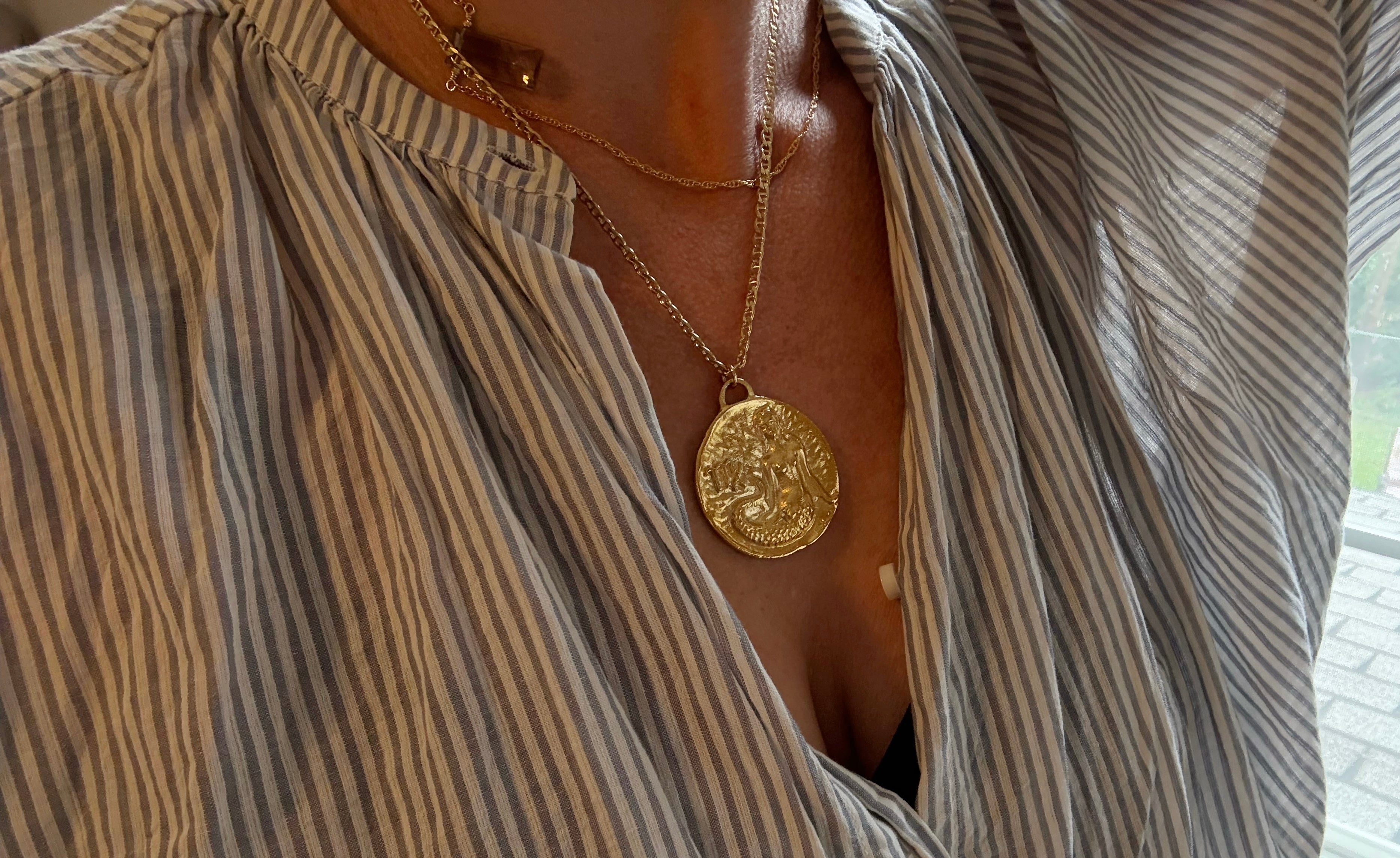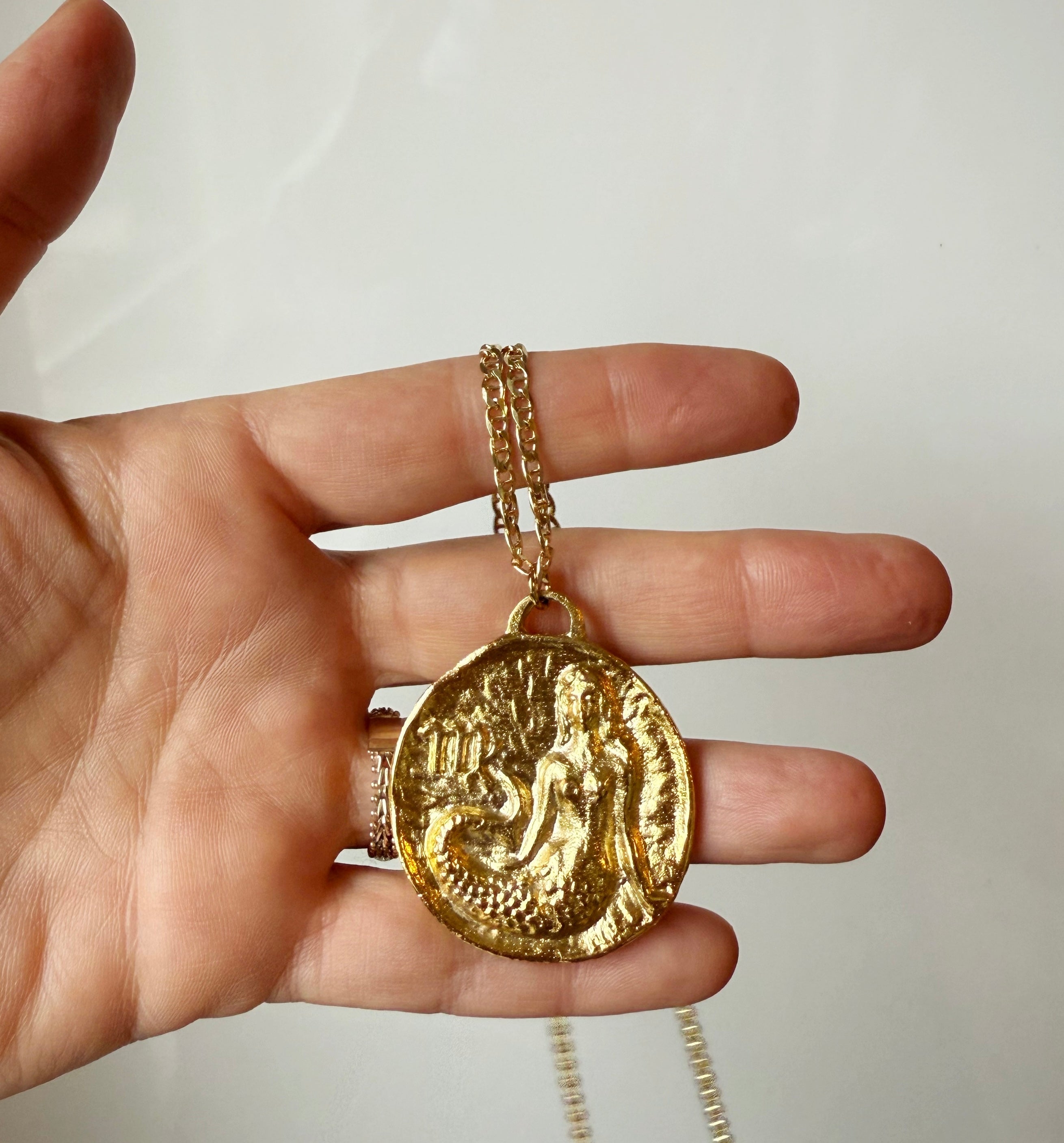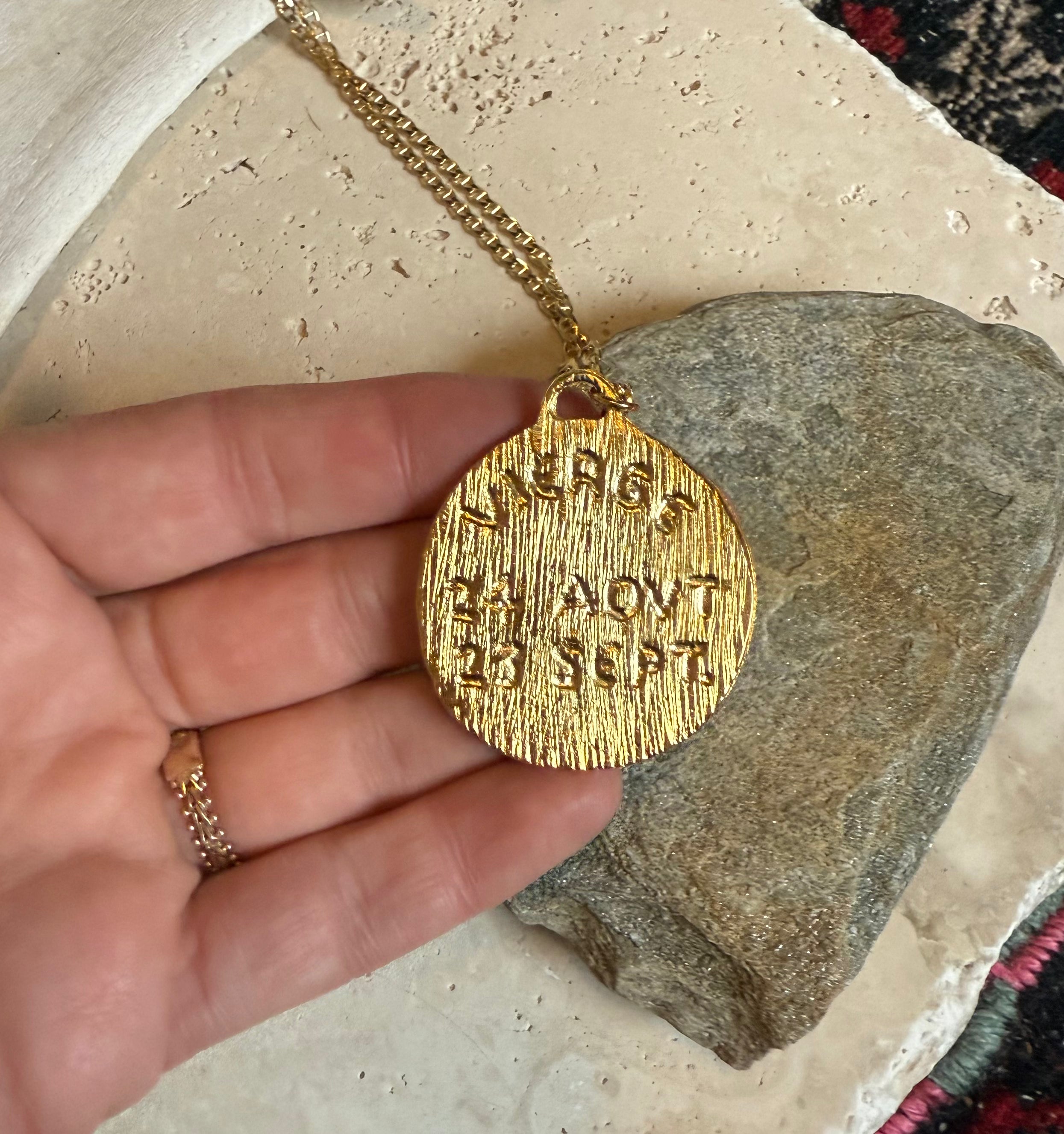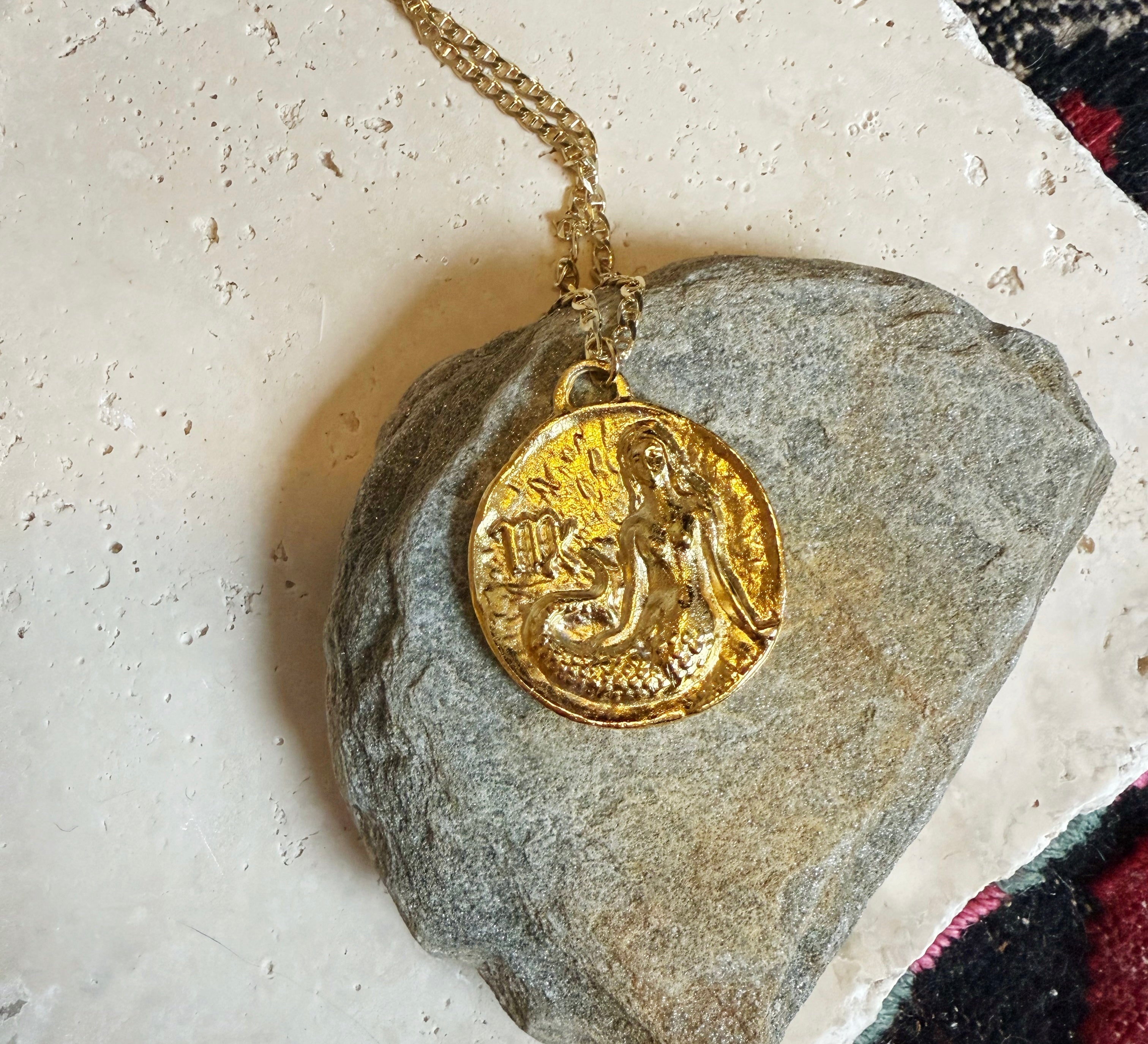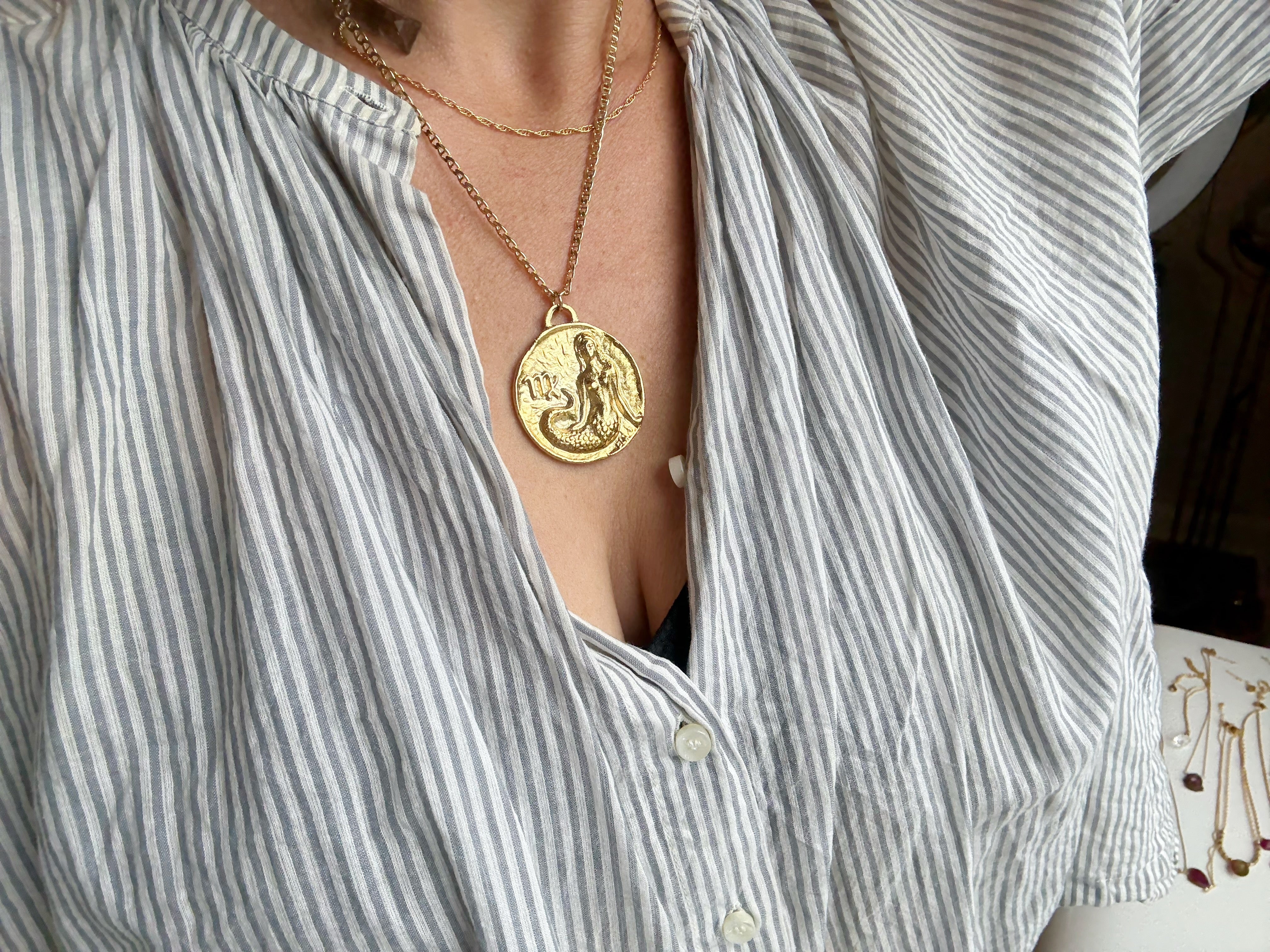 One of a Kind vintage French Zodiac Pendant that we had gold plated in 22k gold and put on gold plated mariner chain as it called for this perfect matching.
