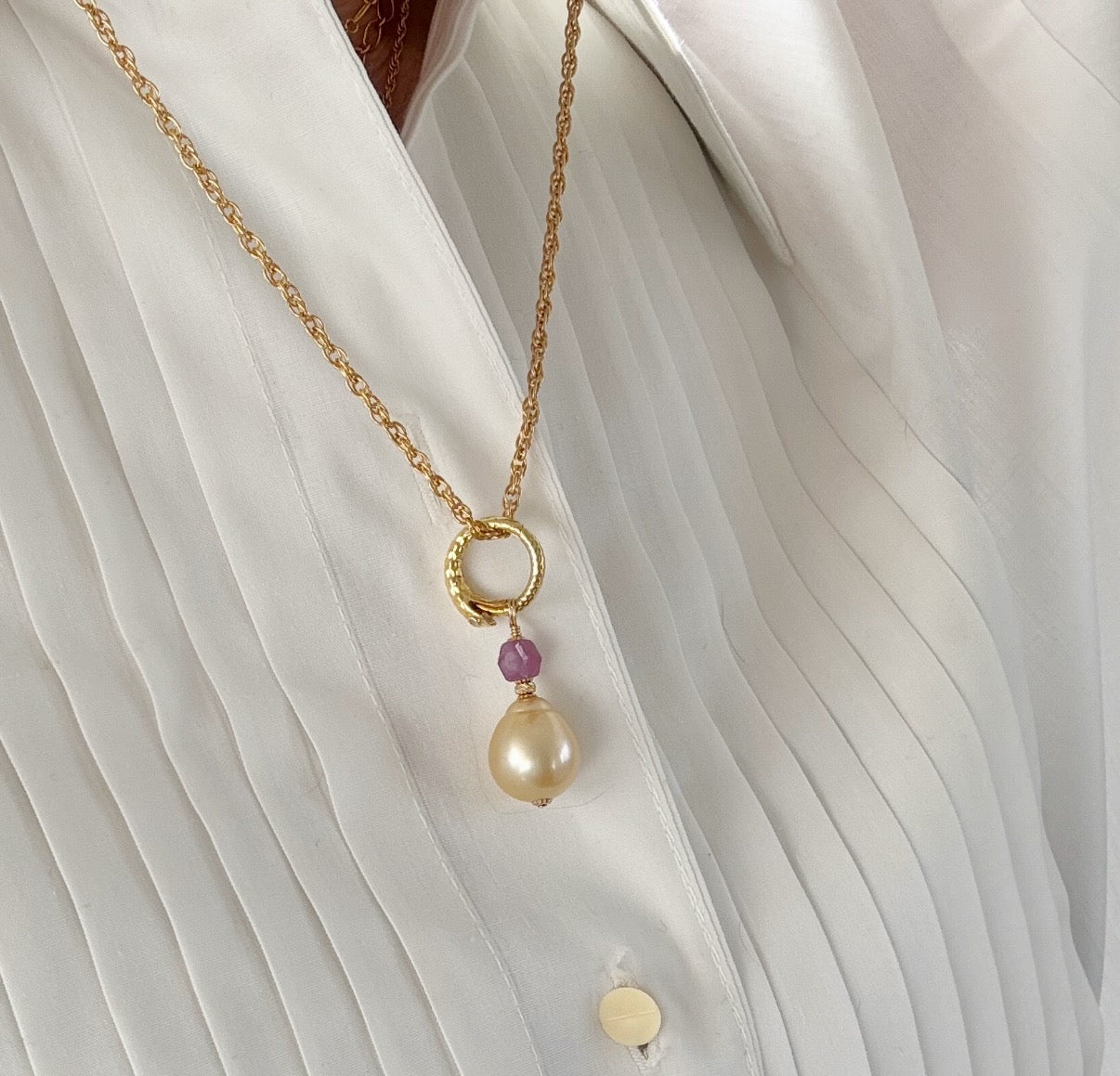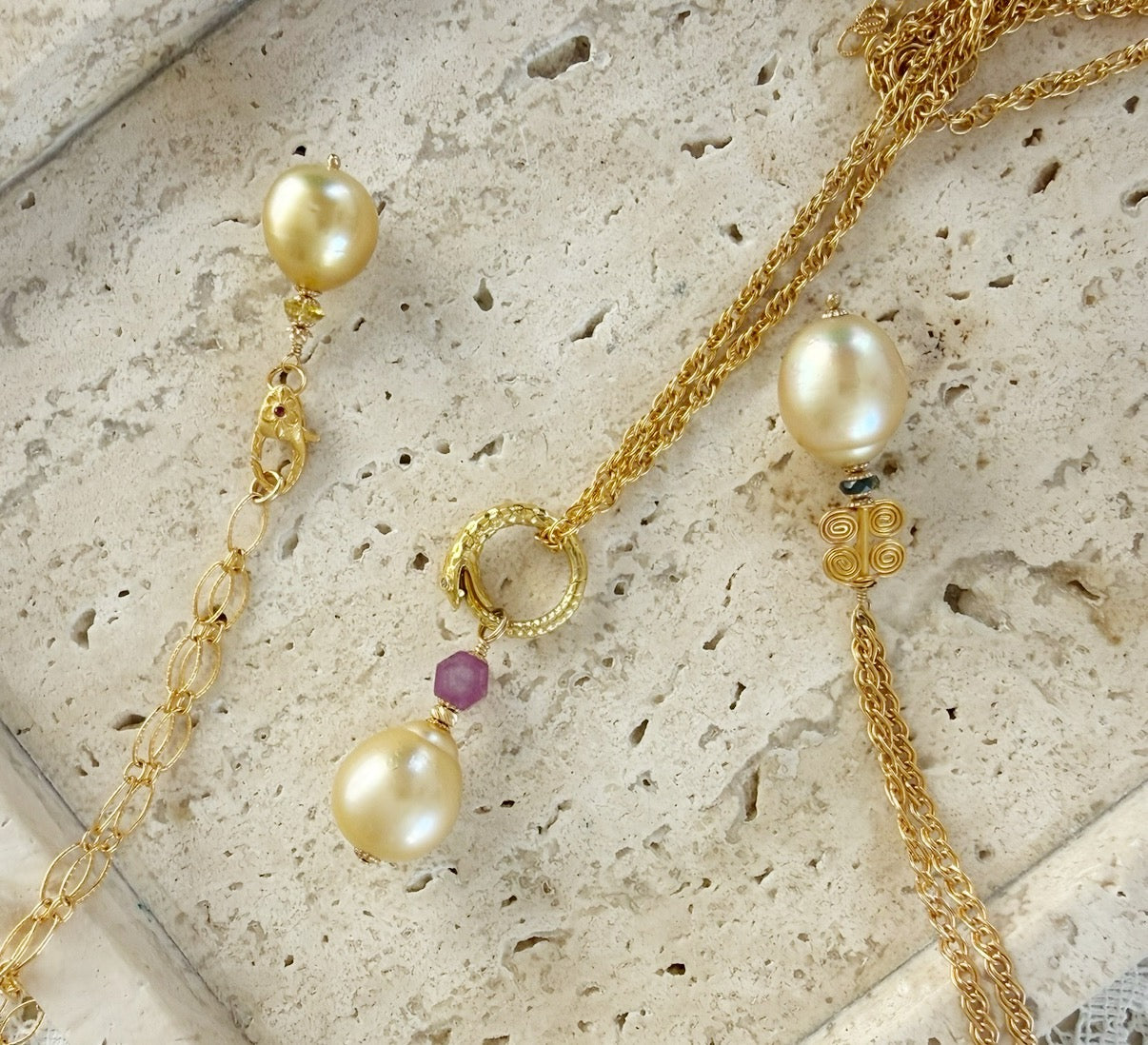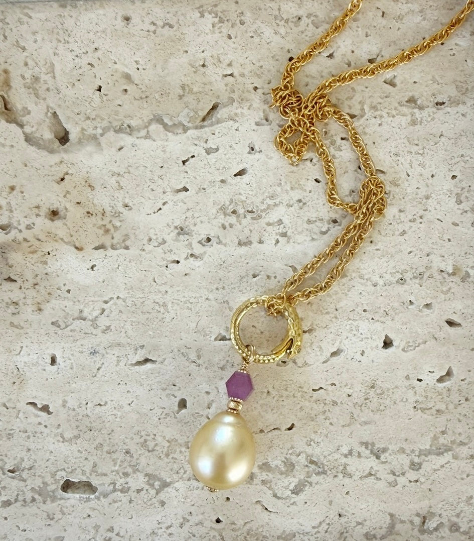 South Sea Golden Orb Pearl from Australia with ruby star sapphire hexagon in honor of Venus on 22k gold plated serpent ouroboros (cycles of life and the place where eclipses occur) placed on a 14k gold fill rope chain that holds us grounded.