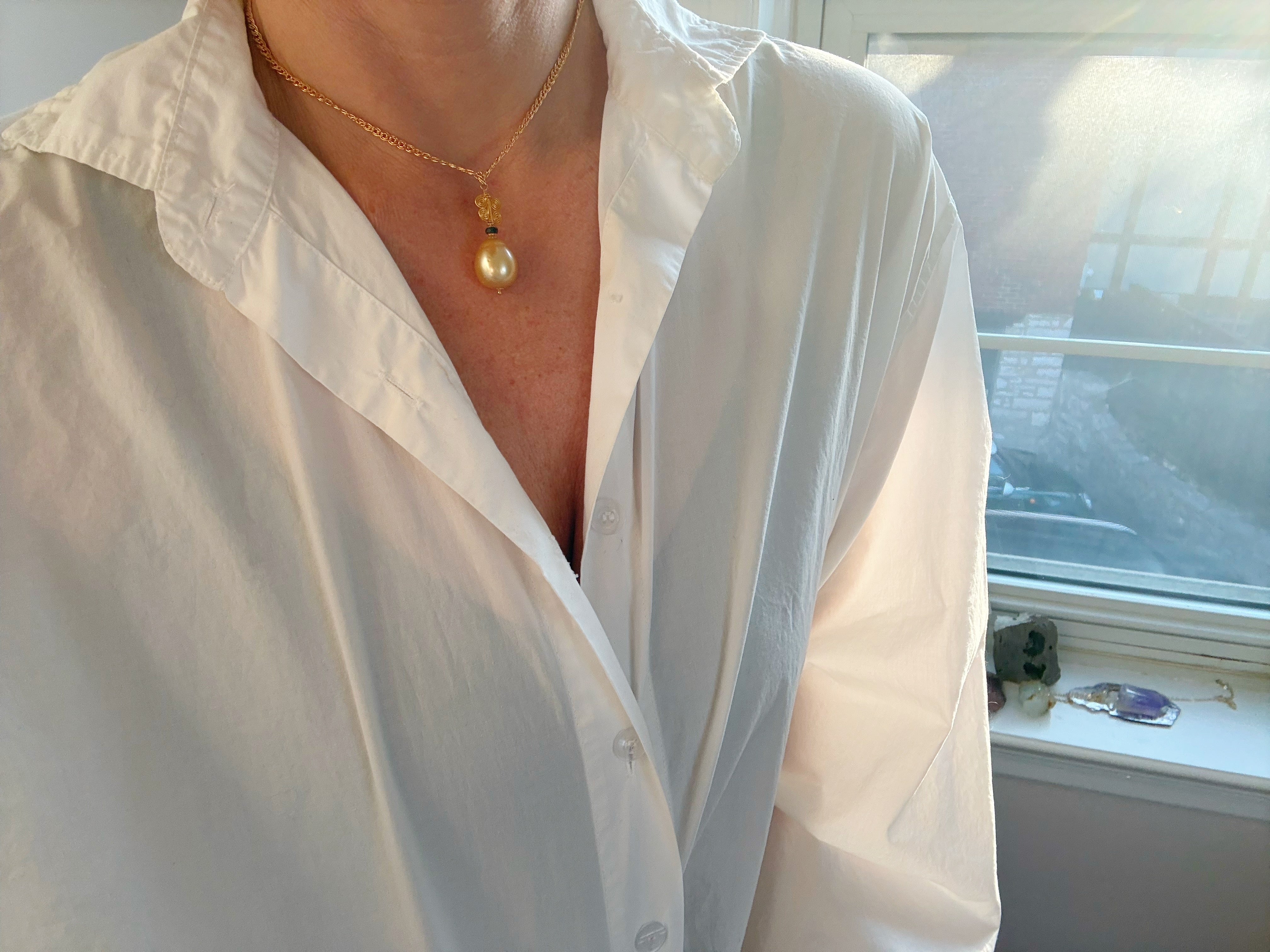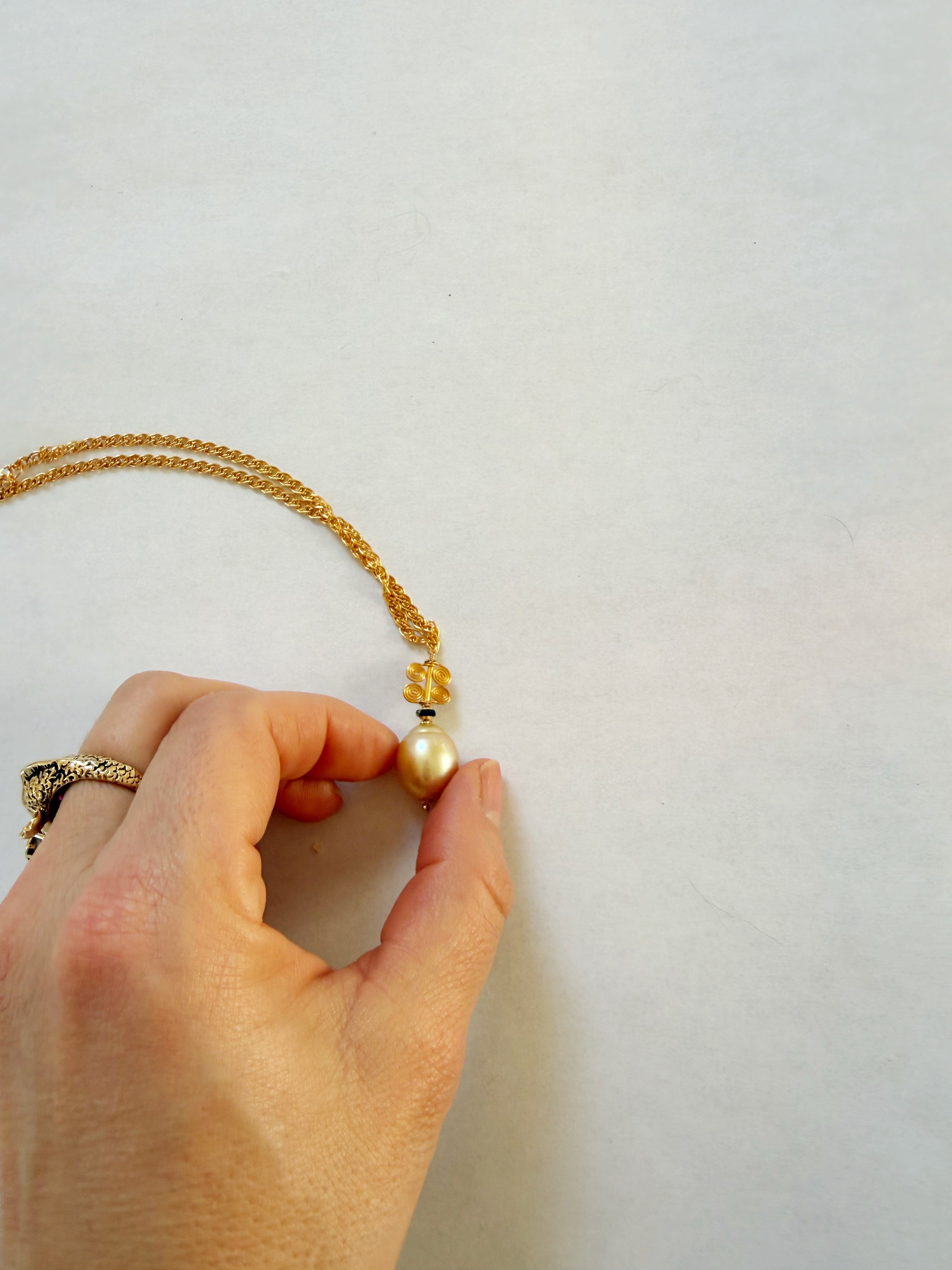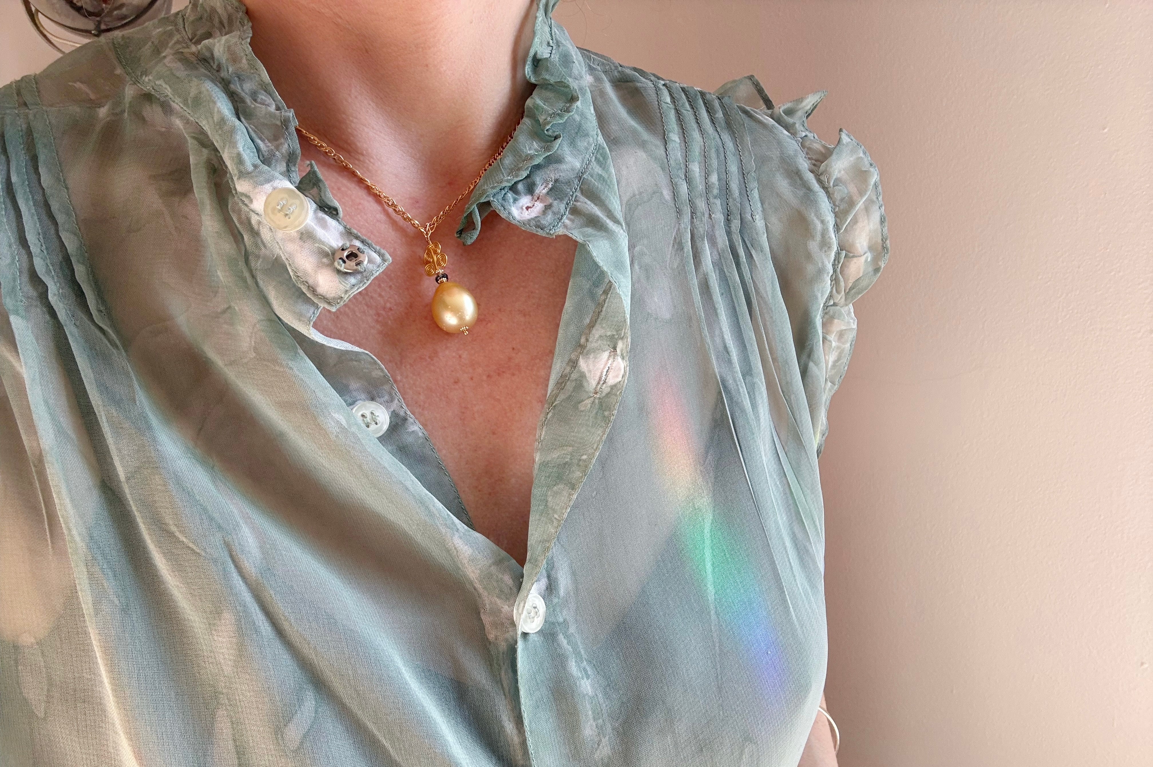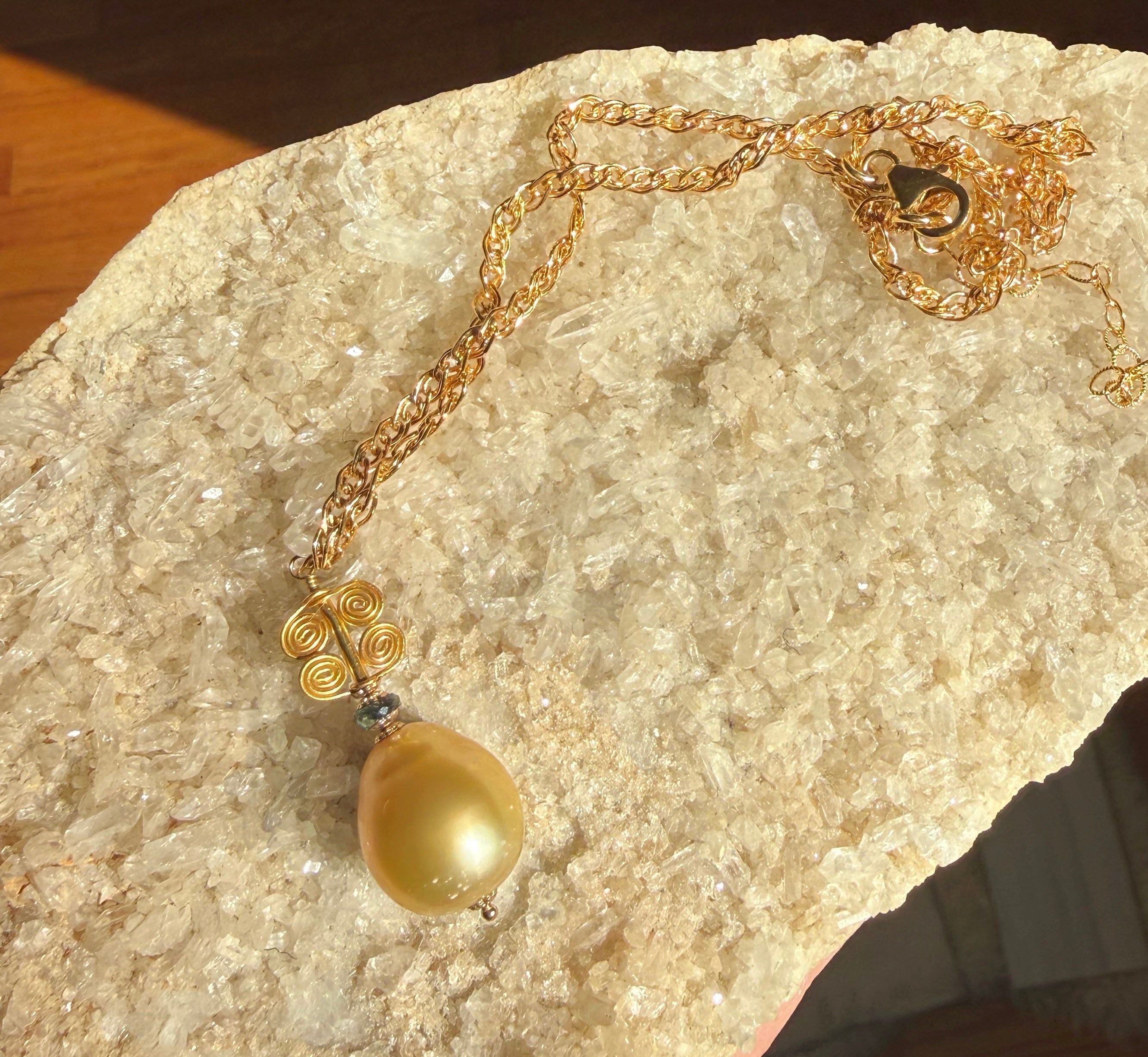 At the center of this piece is a golden South Sea pearl from Australia: an orb of lunar light, rich with warmth, depth, and quiet radiance.