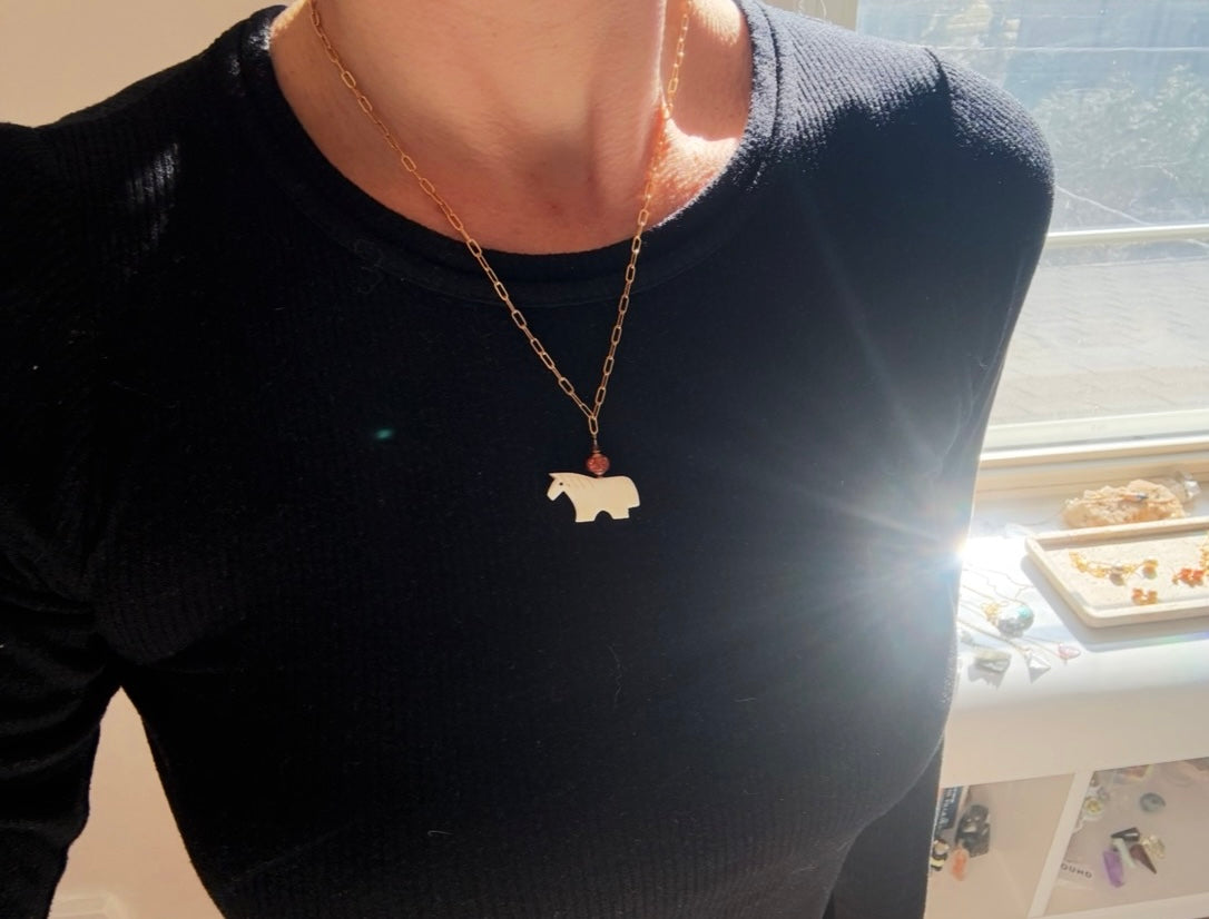 Discarded bone carved horse - vintage pieces we paired with epic sunstone and affixed to 14k gold fill paper clip chain- a talisman that stands beautifully alone or stacked with other magical pieces.