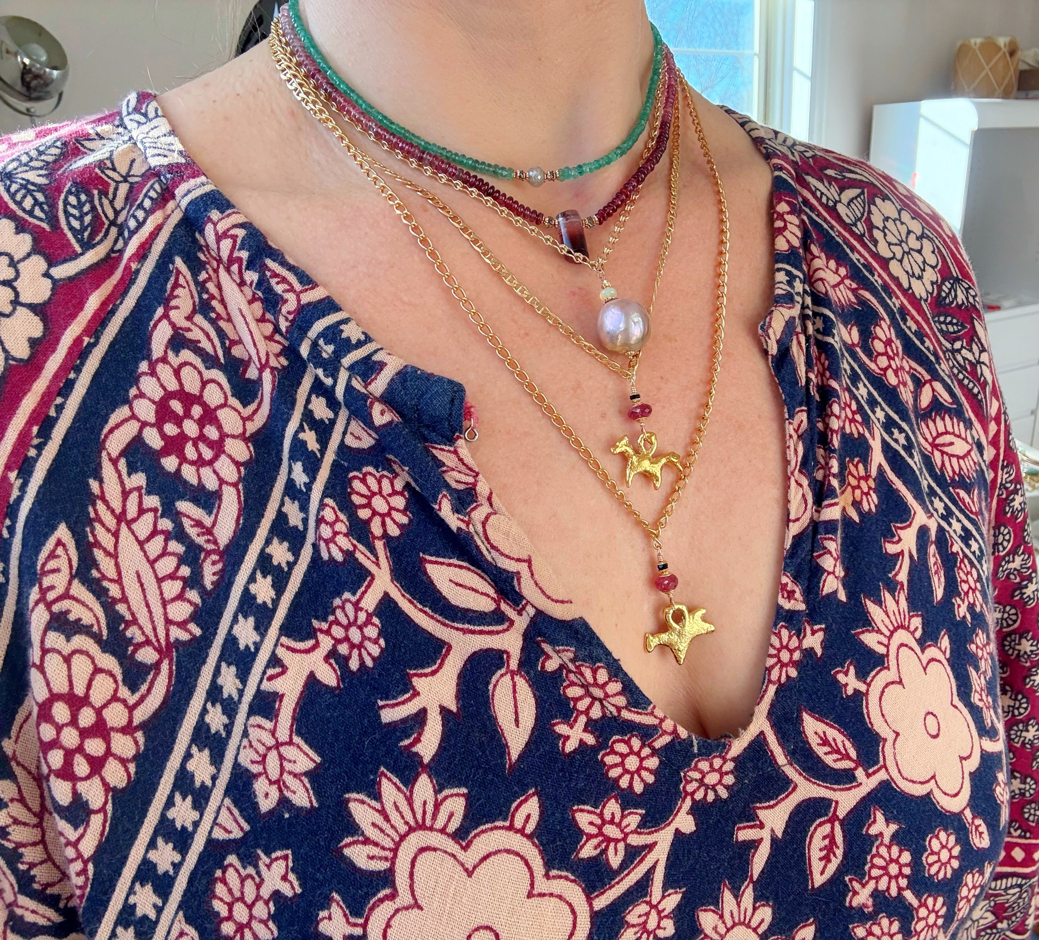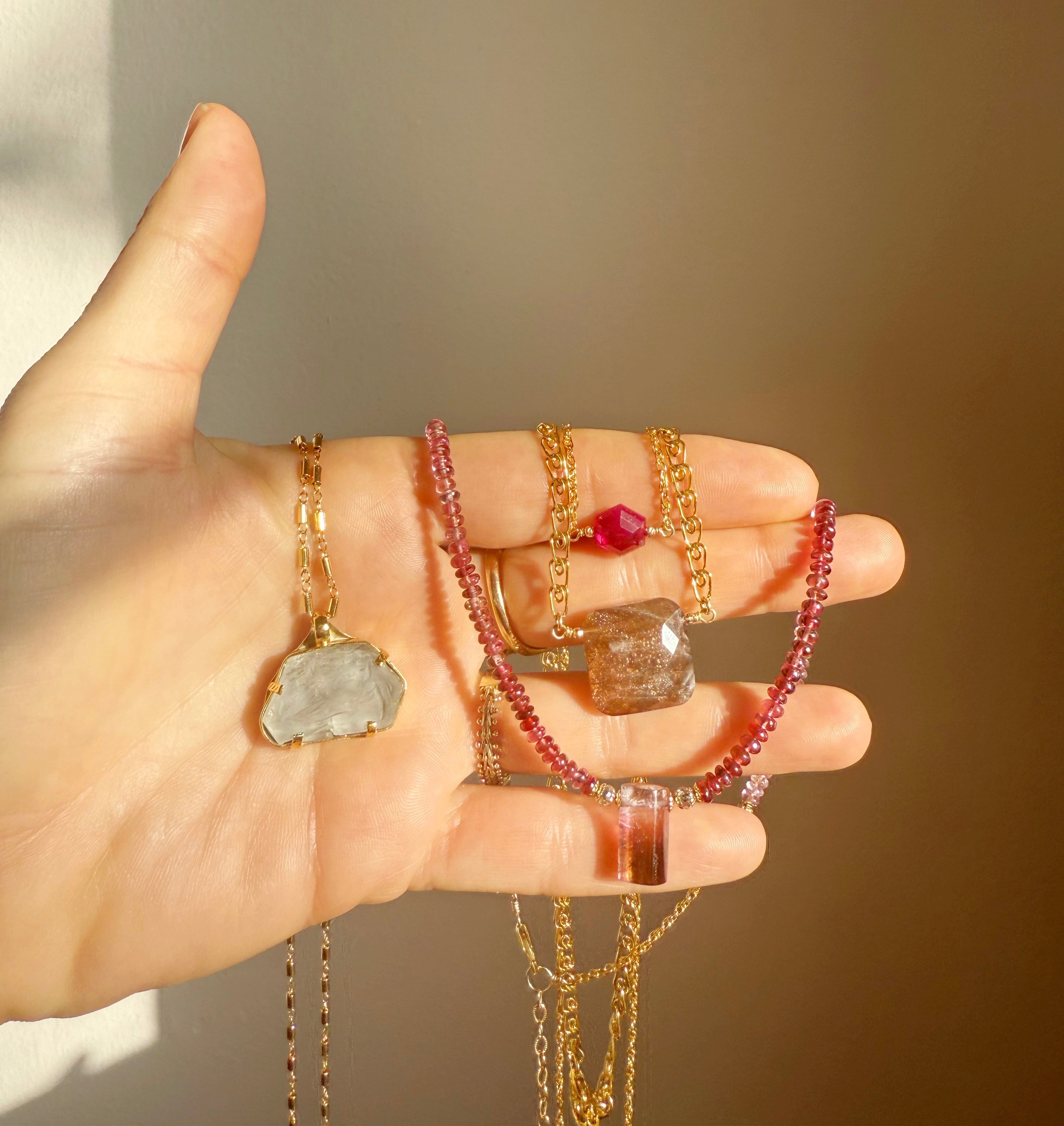 This necklace is a like a study of color....a cascade of burgundy tourmalines that move from light to dark in an ombré fashion, from blush to wine, from softness into depth. Each stone is faceted to catch the light, creating a subtle rhythm of shimmer and shadow along the strand.