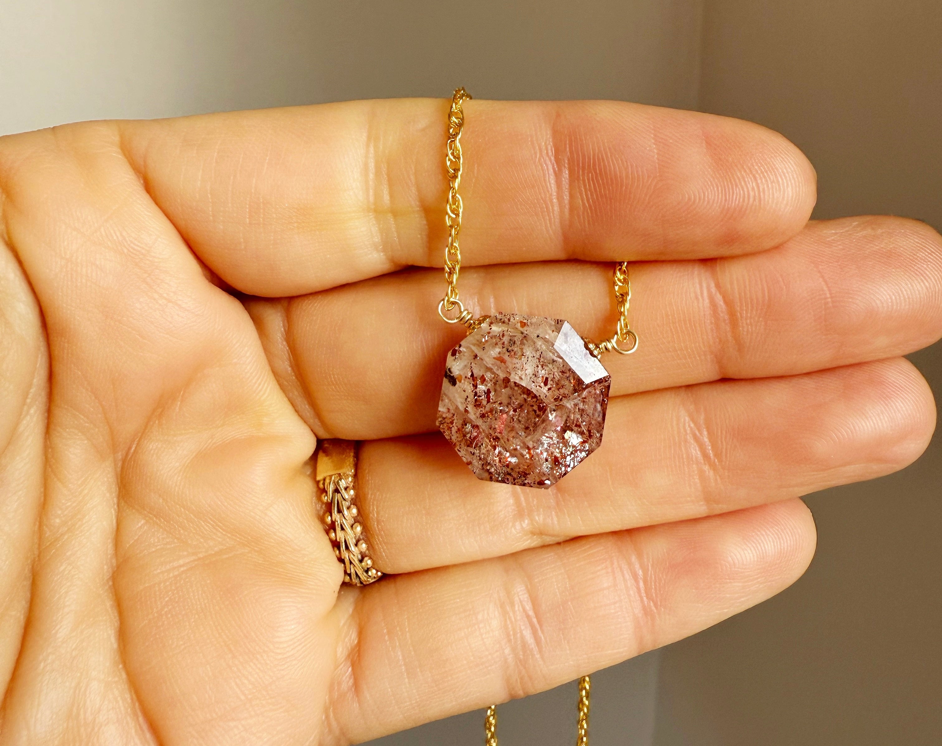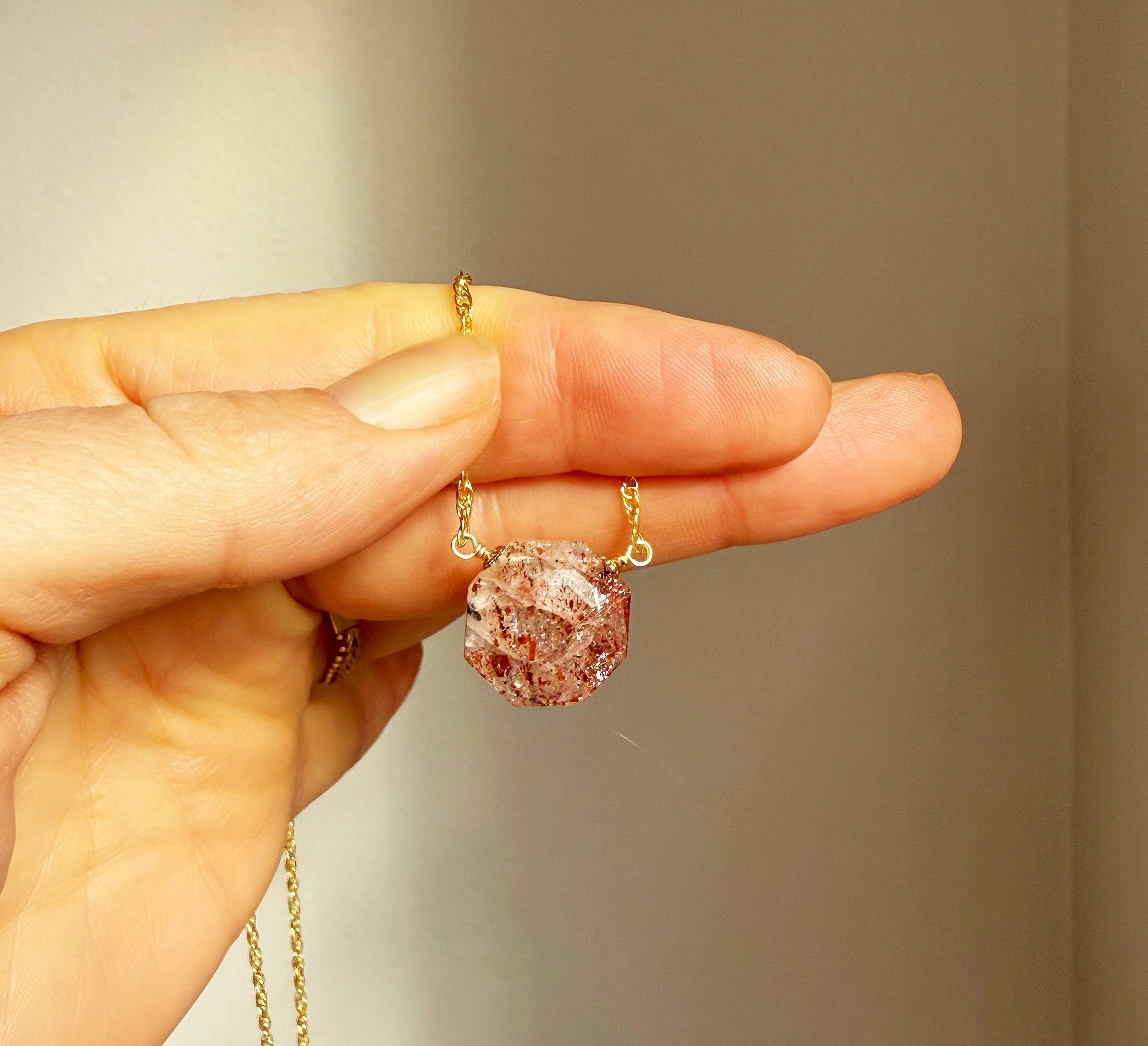 This piece enters the collection as a talisman of pure ignition, a Sunstone carved into a six-sided geometry, each facet catching the glittering rainbows that live inside the stone. The hexagon itself is an ancient symbol of coherence: honeycomb, snowflake, star gate, the architecture of cosmic order. Paired with sunstone-the mineral of inner radiance, self-trust, and the spark that says yes, I will rise, this piece becomes an embodiment of the archetype that wakes your courage from the inside out.