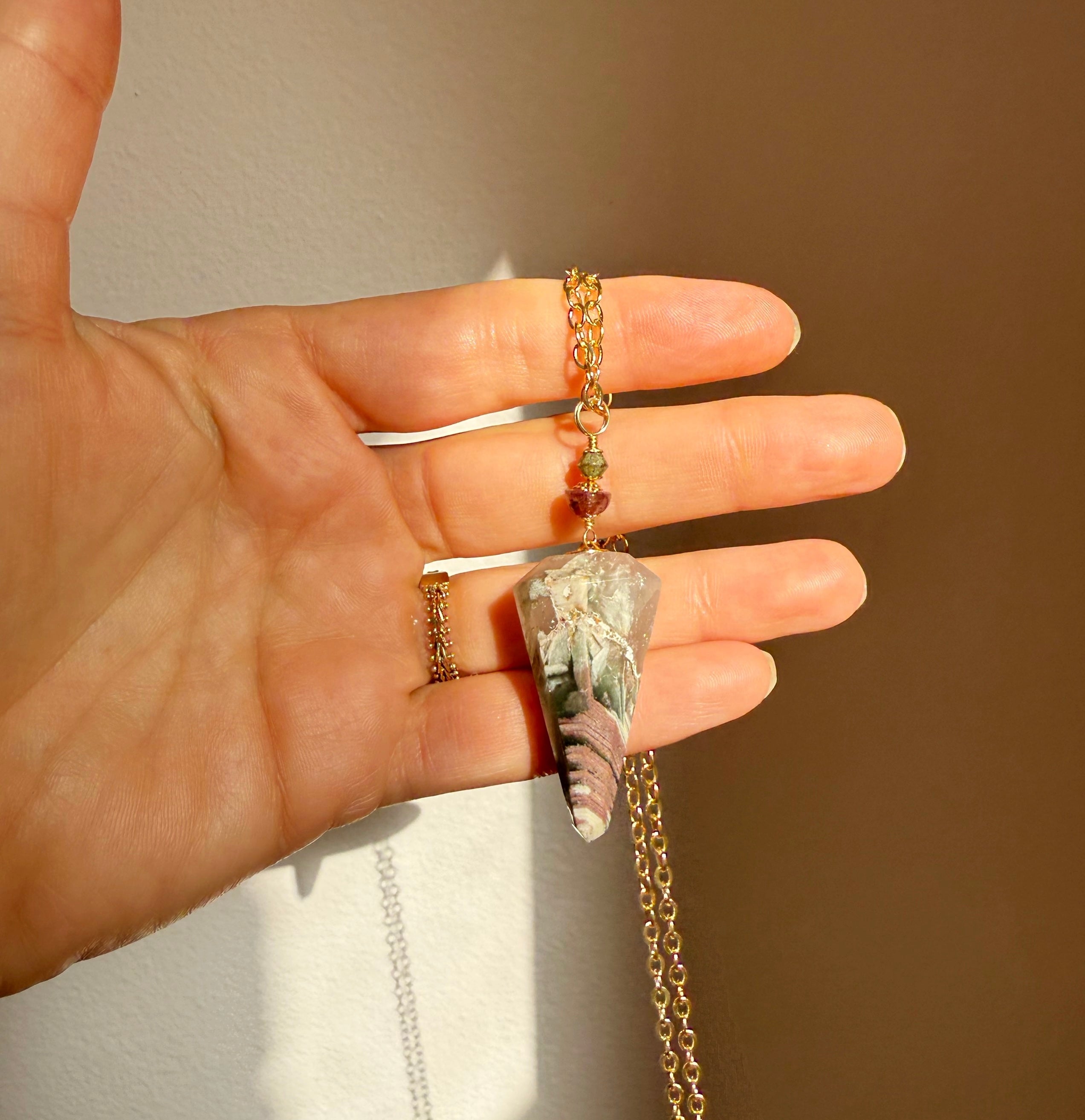 Chlorite that looks like a painted masterpiece, coded with minerals galore and epic coloring- beyond the realm of magic. Made with tourmaline for the heart that is pulsing with glimmers and ancient roman glass for the genie in the bottle wisdom. Essence of ancient magic.