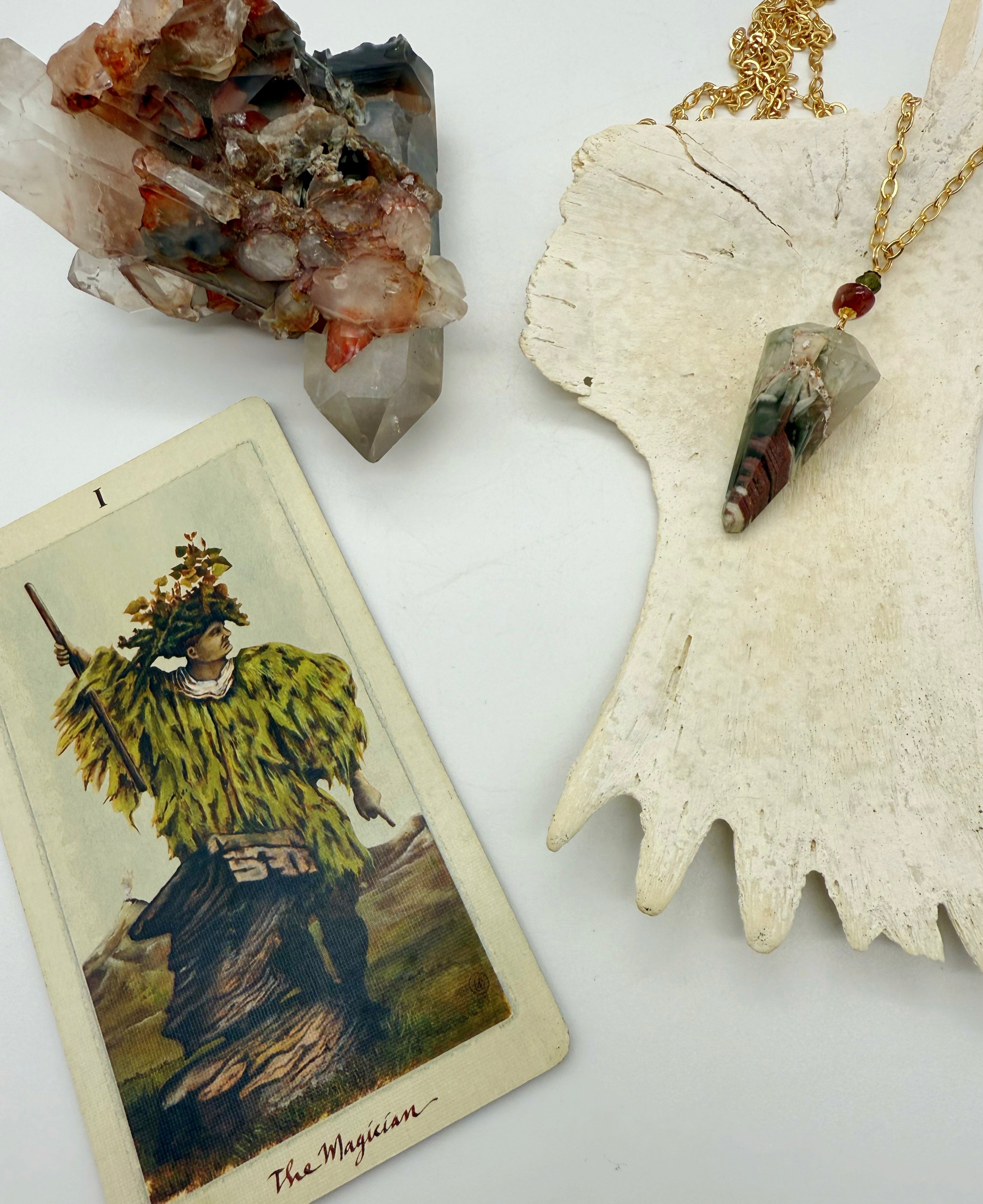 The Magician follows The Fool as the first conscious act of creation. In the Pagan Otherworlds deck, this figure stands between heaven and earth, one hand raised to the cosmos, the other rooted in soil. The bridge between spirit and matter. The Magician reminds us that all the tools we need are already within us, waiting to be remembered.