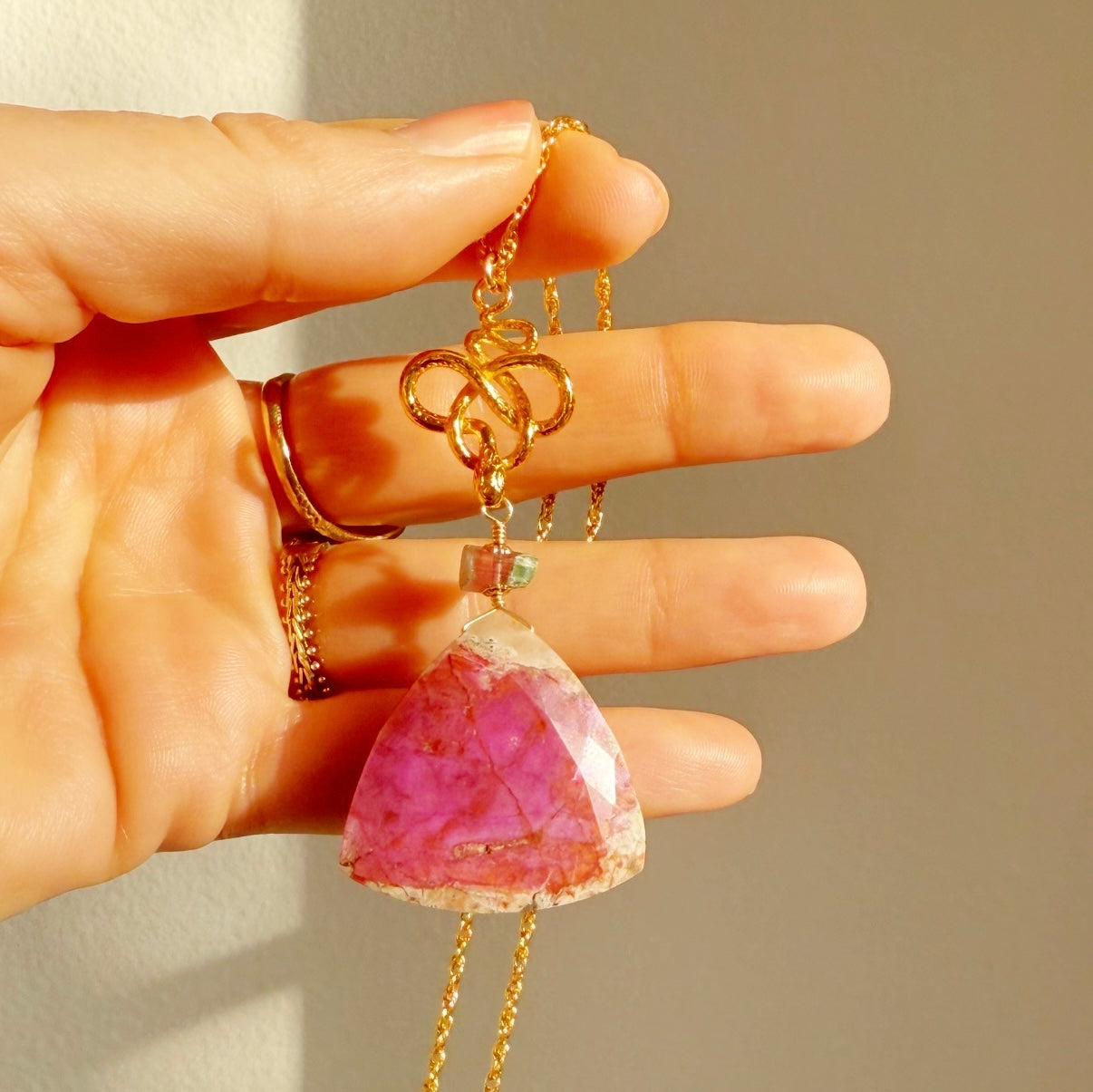 At the center of this one-of-a-kind piece is a large, natural pink that has a heart shape inside on the front and a moon swoosh on the back....pure life force and love.