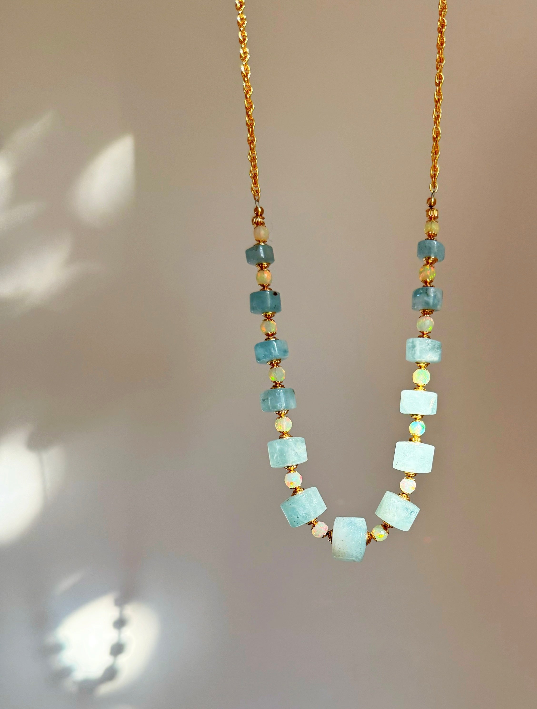 Amazing pieces of faceted aquamarine paired with bright opals that hold pinks yellows and oranges in their center core like mini galaxies alive under water.