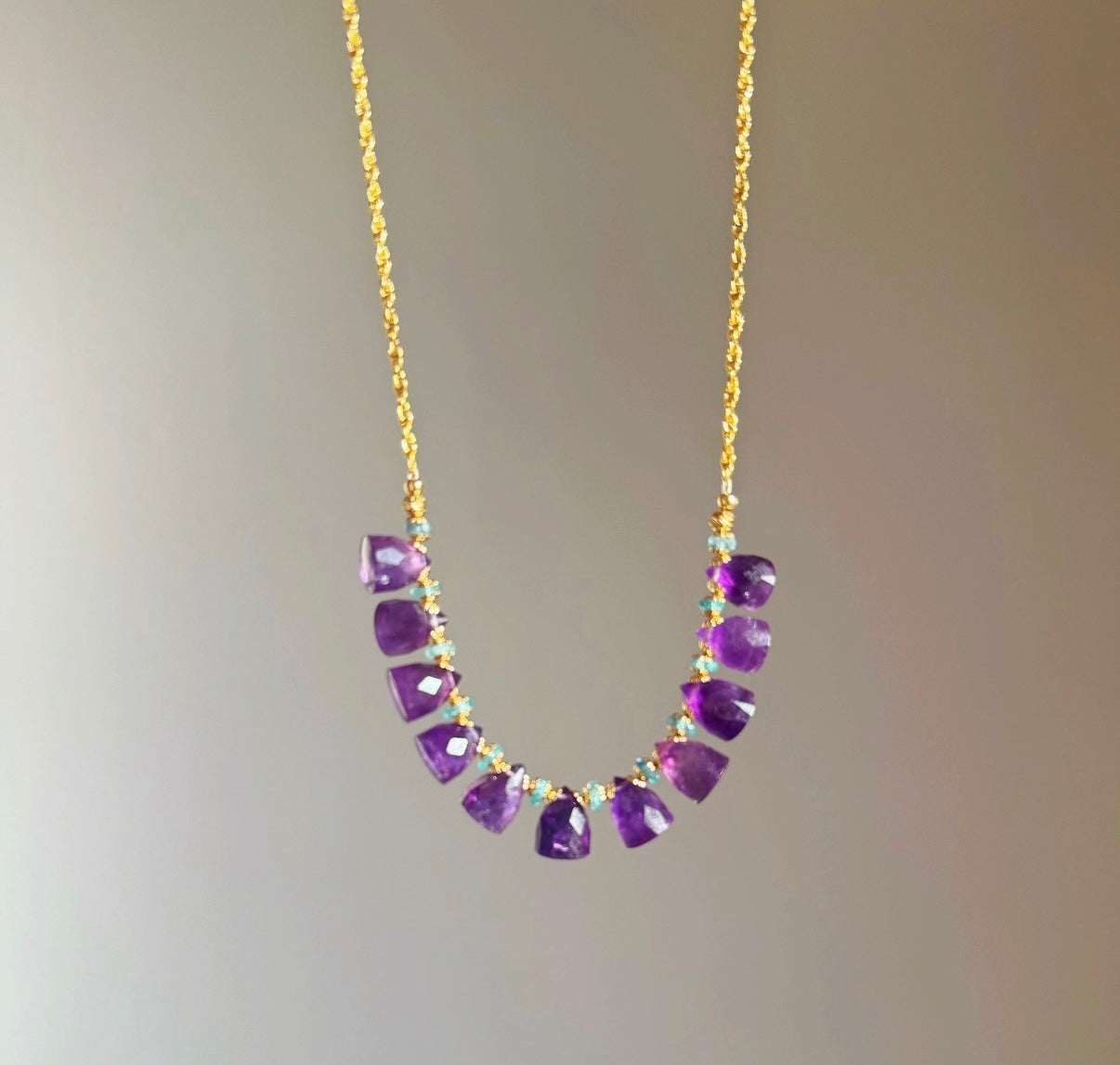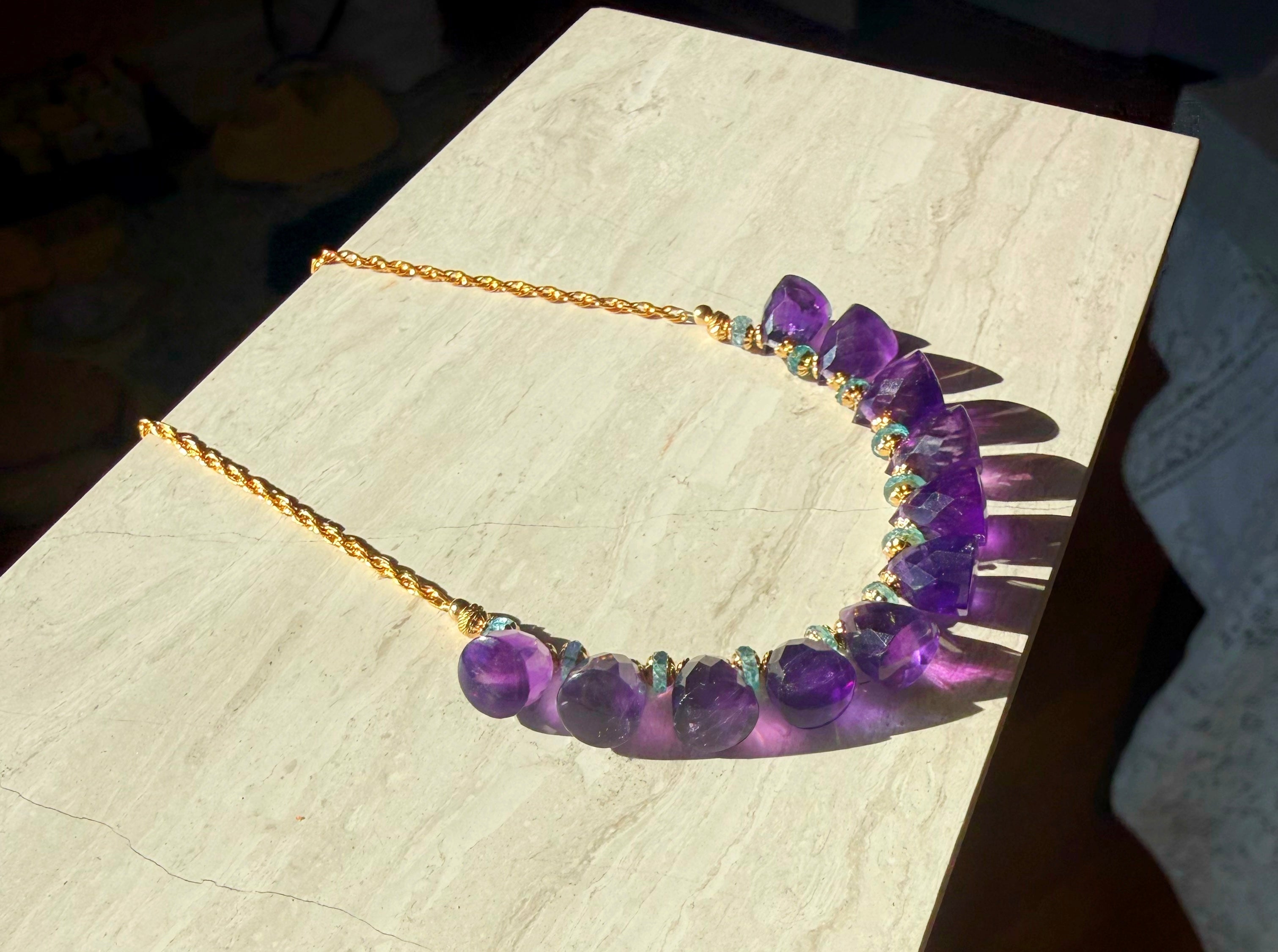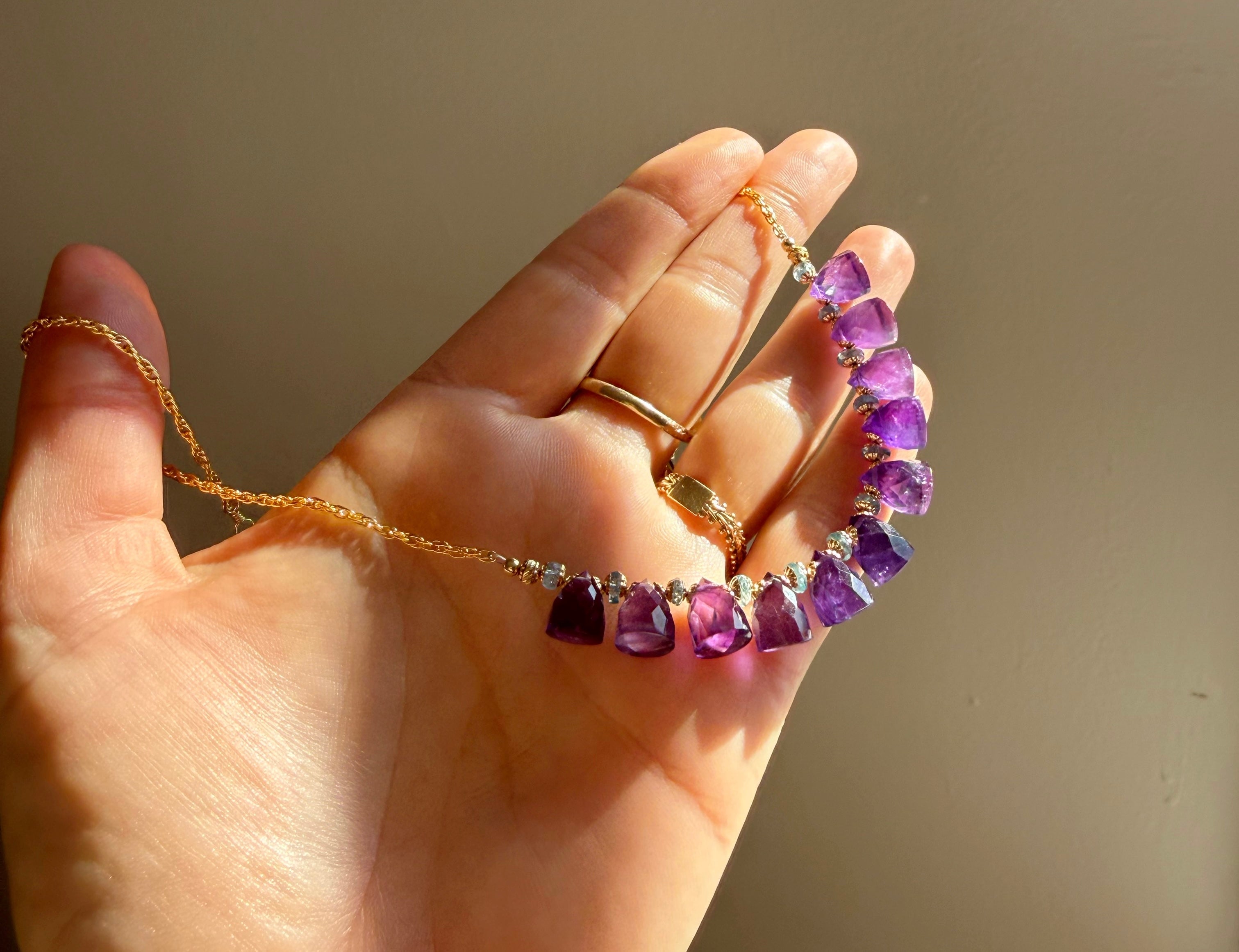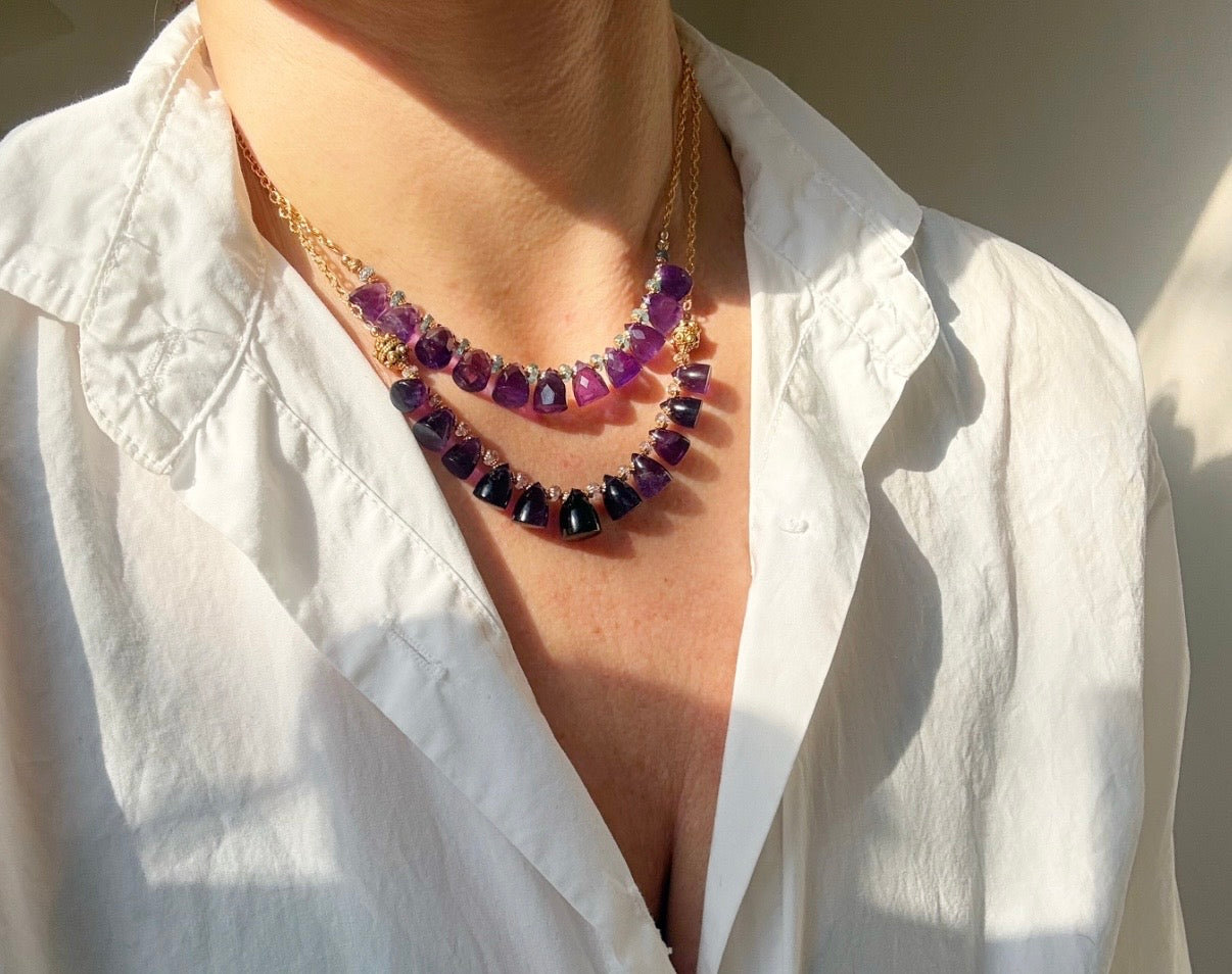 14k gold fill chain and faceted bright amethyst stones from Brazil paired with mini blue sapphires for wisdom and the third eye.